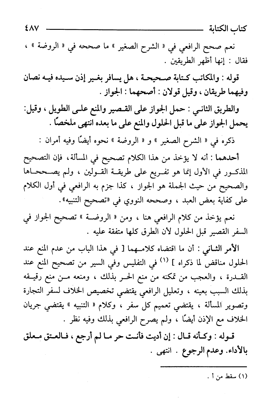 الأمر الثاني: أن ما اقتضاه كلامهما [في هذا الباب من عدم المنع عند الحلول مناقض لما ذكراه] (¬1) في التفليس وفي السير من تصحيح المنع عند القدرة، والعجب من تمكنه من منع الحر بذلك، ومنعه من منع رقيقه بذلك السبب بعينه، وتعليل الرافعي يقتضي تخصيص الخلاف لسفر التجارة وتصوير المسألة، يقتضي تعميم كل سفر، وكلام "التنبيه" يقتضي جريان الخلاف مع الإذن أيضًا، ولم يصرح الرافعي بذلك وفيه نظر.