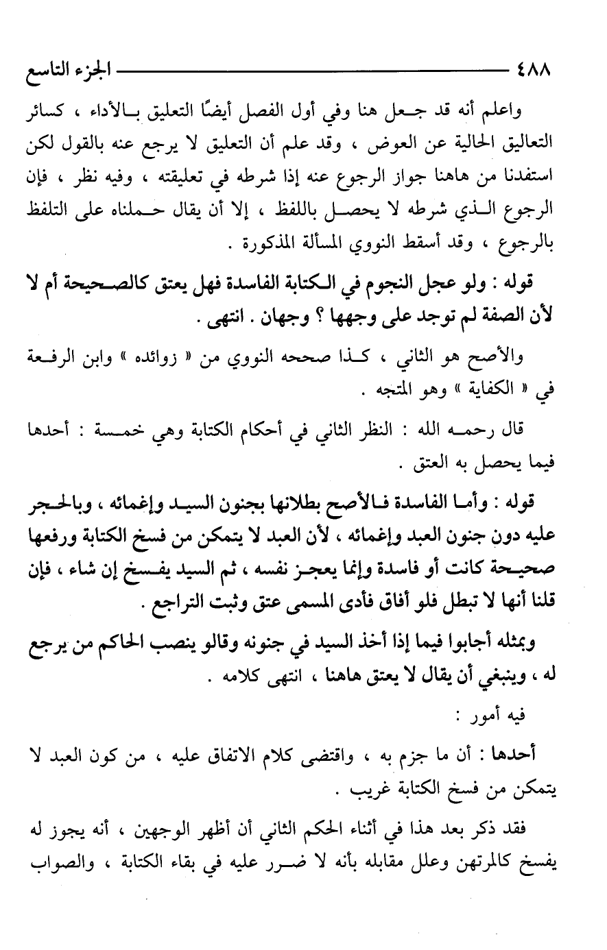 واعلم أنه قد جعل هنا وفي أول الفصل أيضًا التعليق بالأداء، كسائر التعاليق الحالية عن العوض، وقد علم أن التعليق لا يرجع عنه بالقول لكن استفدنا من هاهنا جواز الرجوع عنه إذا شرطه في تعليقته، وفيه نظر، فإن الرجوع الذي شرطه لا يحصل باللفظ، إلا أن يقال حملناه على التلفظ بالرجوع، وقد أسقط النووي المسألة المذكورة.
