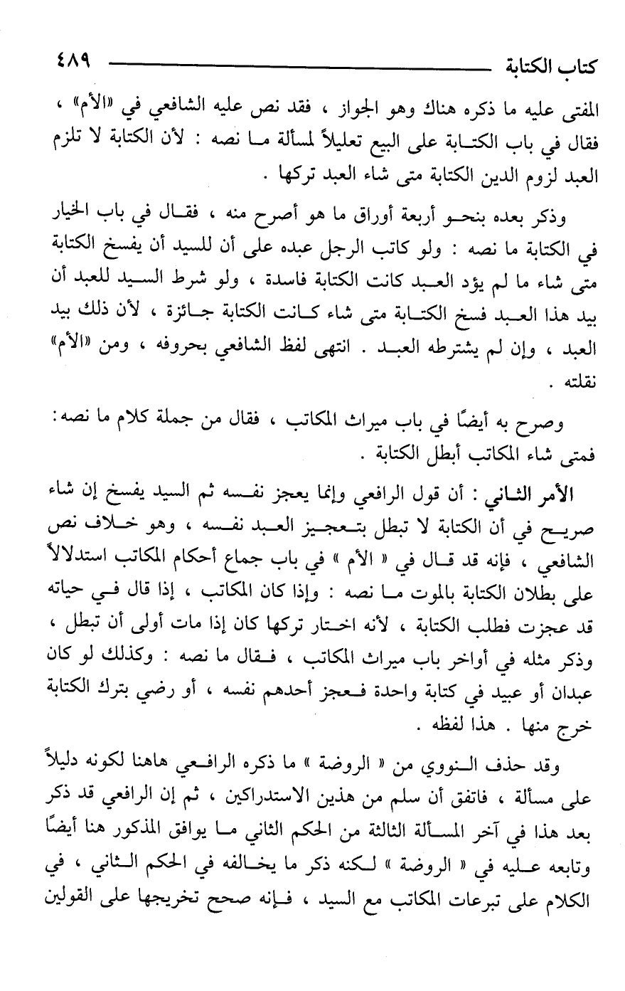 الأمر الثاني: أن قول الرافعي وإنما يعجز نفسه ثم السيد يفسخ إن شاء صريح في أن الكتابة لا تبطل بتعجيز العبد نفسه، وهو خلاف نص الشافعي، فإنه قد قال في "الأم" في باب جماع أحكام المكاتب استدلالًا على بطلان الكتابة بالموت ما نصه: وإذا كان المكاتب، إذا قال في حياته قد عجزت فطلب الكتابة، لأنه اختار تركها كان إذا مات أولى أن تبطل، وذكر مثله في أواخر باب ميراث المكاتب، فقال ما نصه: وكذلك لو كان عبدان أو عبيد في كتابة واحدة فعجز أحدهم نفسه، أو رضي بترك الكتابة خرج منها. هذا لفظه.