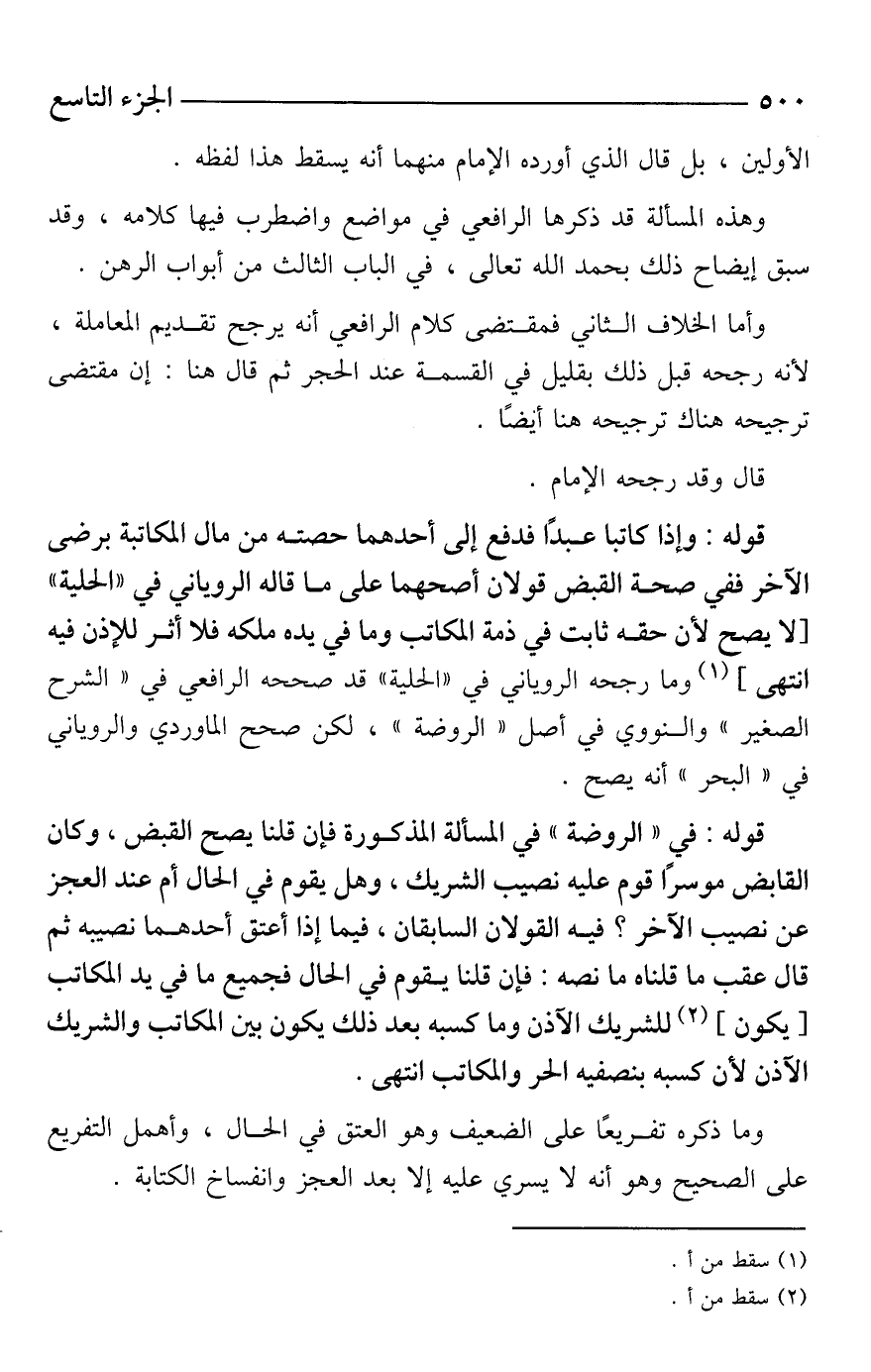 قوله: في "الروضة" في المسألة المذكورة فإن قلنا يصح القبض، وكان القابض موسرًا قوم عليه نصيب الشريك، وهل يقوم في الحال أم عند العجز عن نصيب الآخر؟ فيه القولان السابقان، فيما إذا أعتق أحدهما نصيبه ثم قال عقب ما قلناه ما نصه: فإن قلنا يقوم في الحال فجميع ما في يد المكاتب [يكون] (¬2) للشريك الآذن وما كسبه بعد ذلك يكون بين المكاتب والشريك الآذن لأن كسبه بنصفيه الحر والمكاتب انتهى.