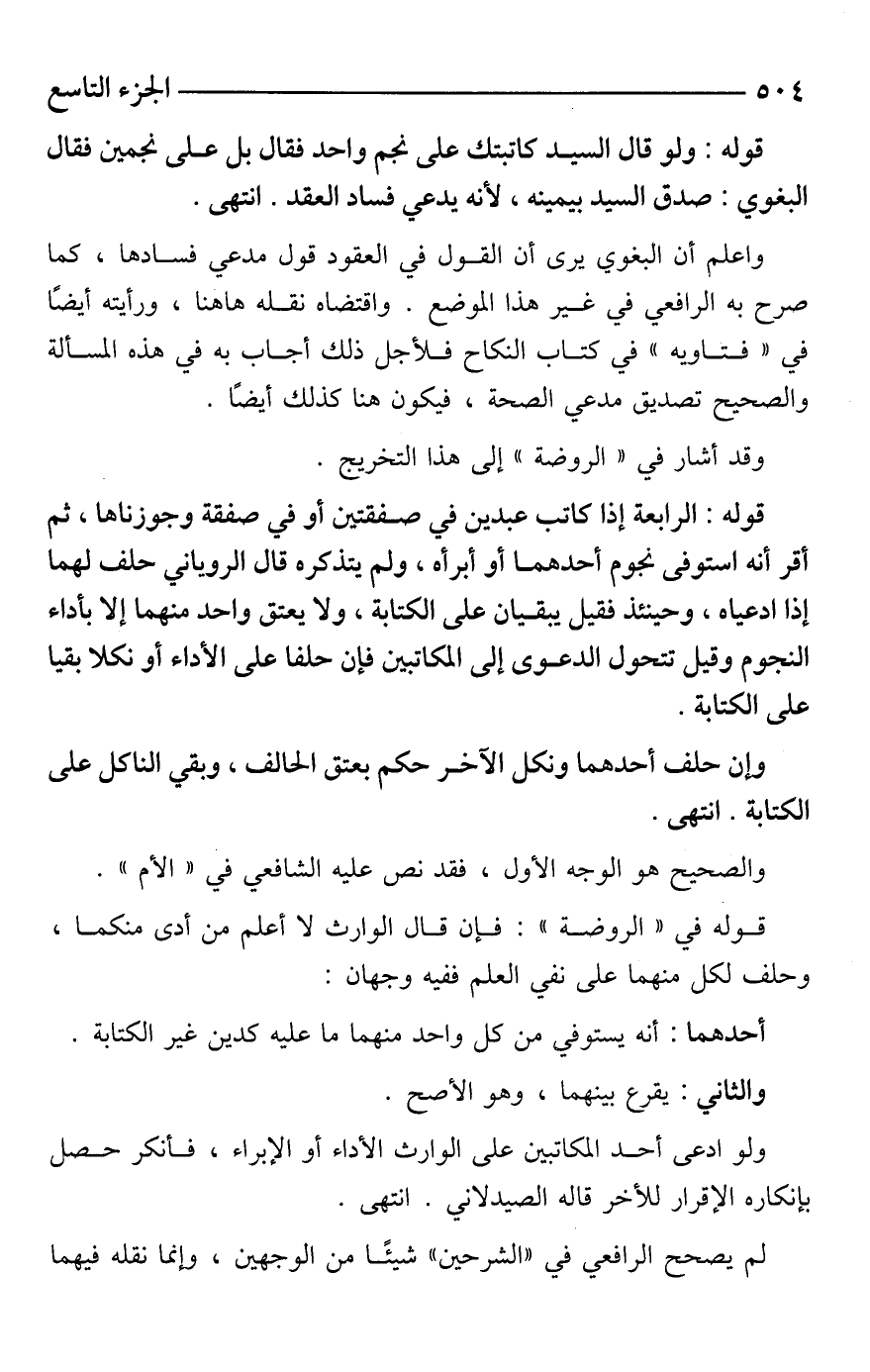 قوله: ولو قال السيد كاتبتك على نجم واحد فقال بل على نجمين فقال البغوي: صدق السيد بيمينه، لأنه يدعي فساد العقد. انتهى.