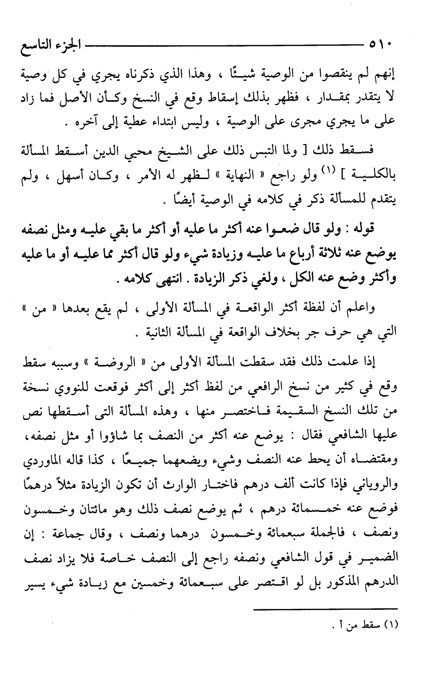 فسقط ذلك [ولما التبس ذلك على الشيخ محيي الدين أسقط المسألة بالكلية] (¬1) ولو راجع "النهاية" لظهر له الأمر، وكان أسهل، ولم يتقدم للمسألة ذكر في كلامه في الوصية أيضًا.