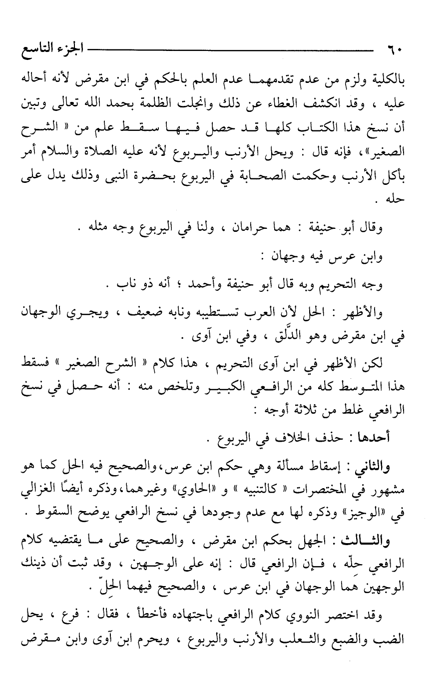 بالكلية ولزم من عدم تقدمهما عدم العلم بالحكم في ابن مقرض لأنه أحاله عليه، وقد انكشف الغطاء عن ذلك وانجلت الظلمة بحمد الله تعالى وتبين أن نسخ هذا الكتاب كلها قد حصل فيها سقط علم من "الشرح الصغير"، فإنه قال: ويحل الأرنب واليربوع لأنه -عليه الصلاة والسلام- أمر بأكل الأرنب وحكمت الصحابة في اليربوع بحضرة النبى وذلك يدل على حله.