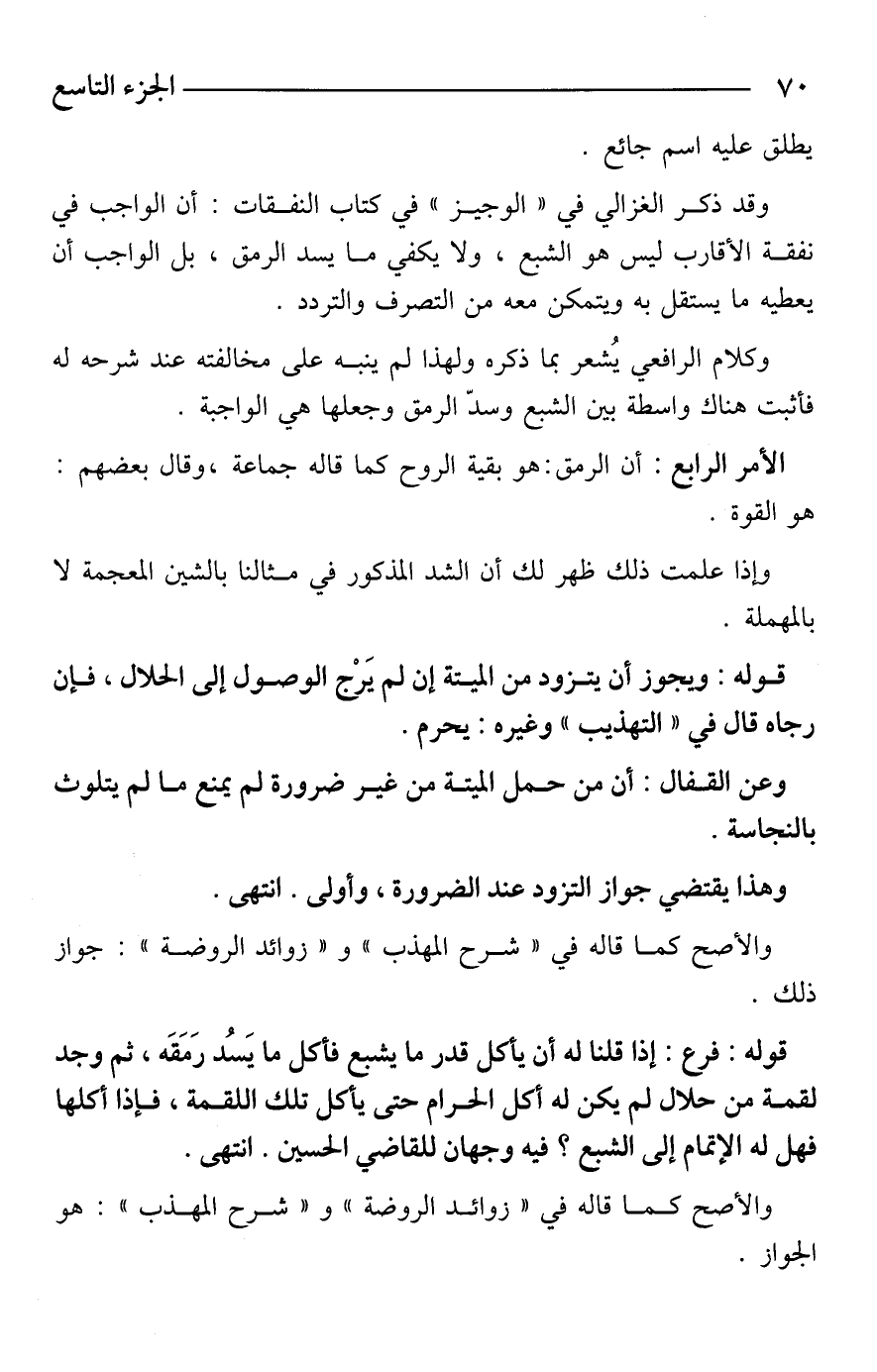وقد ذكر الغزالي في "الوجيز" في كتاب النفقات: أن الواجب في نفقة الأقارب ليس هو الشبع، ولا يكفي ما يسد الرمق، بل الواجب أن يعطيه ما يستقل به ويتمكن معه من التصرف والتردد.