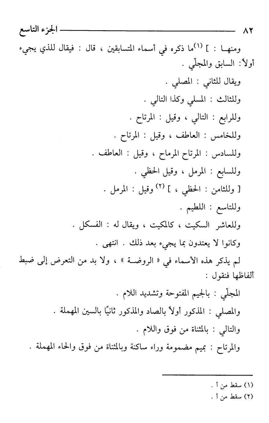 ومنها: ] (¬1) ما ذكره في أسماء المتسابقين، قال: فيقال للذي يجيء أولًا: السابق والمجلّي.