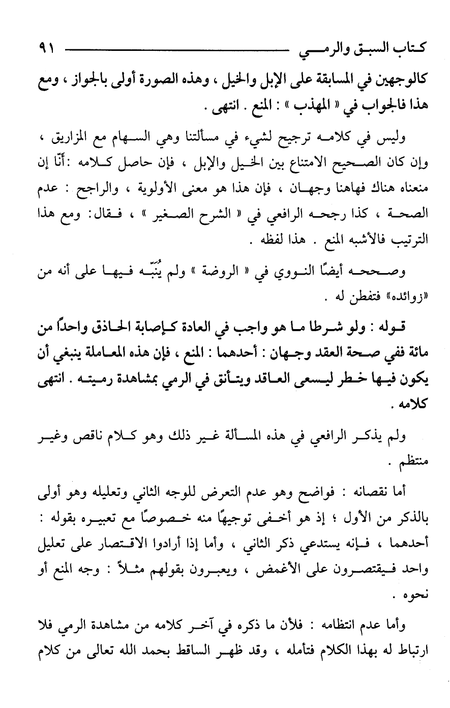 وليس في كلامه ترجيح لشيء في مسألتنا وهي السهام مع المزاريق، وإن كان الصحيح الامتناع بين الخيل والإبل، فإن حاصل كلامه: أَنّا إن منعناه هناك فهاهنا وجهان، فإن هذا هو معنى الأولوية، والراجح: عدم الصحة، كذا رجحه الرافعي في "الشرح الصغير"، فقال: ومع هذا الترتيب فالأشبه المنع. هذا لفظه.
