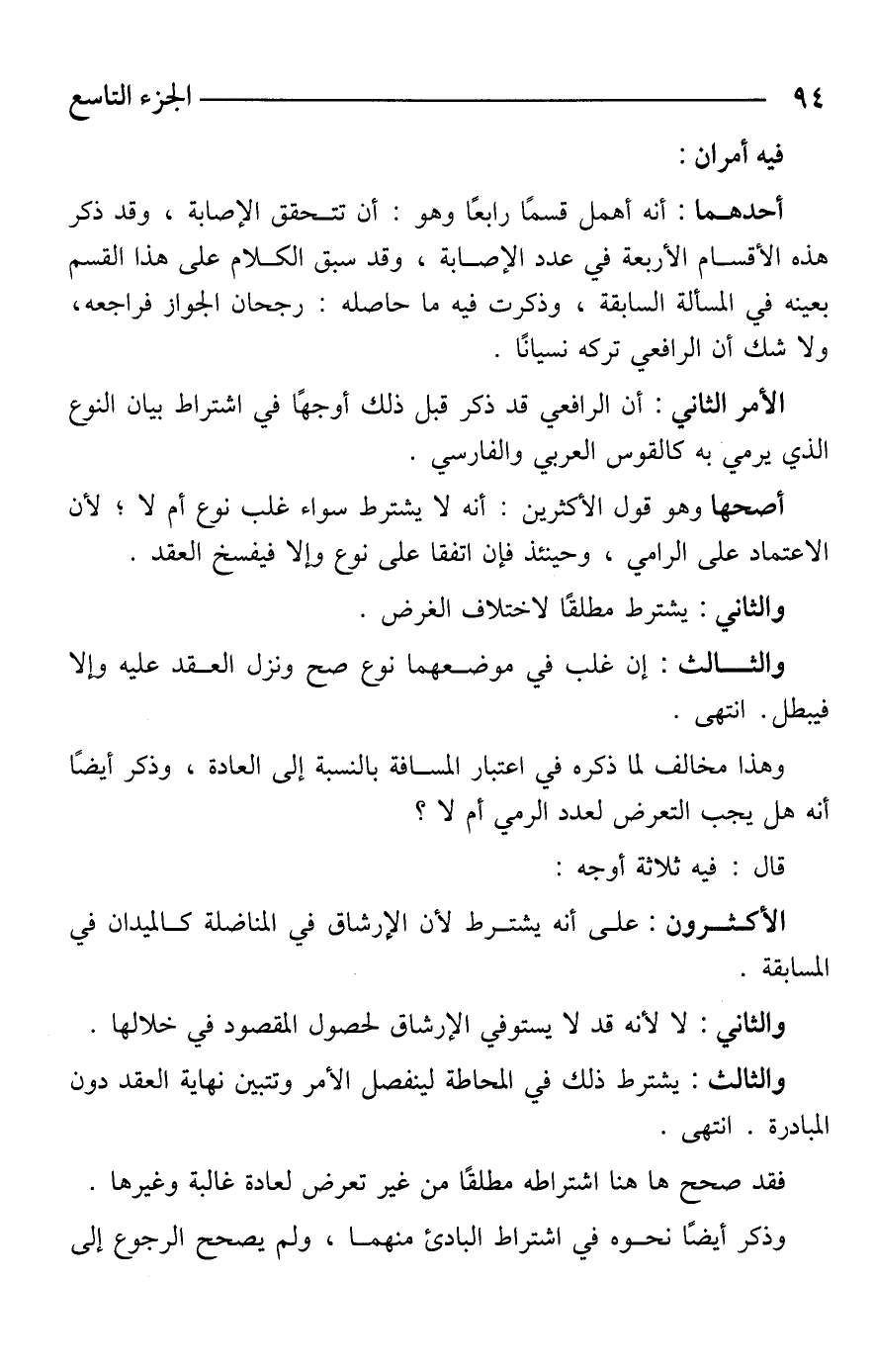 الأمر الثاني: أن الرافعي قد ذكر قبل ذلك أوجهًا في اشتراط بيان النوع الذي يرمي به كالقوس العربي والفارسي.