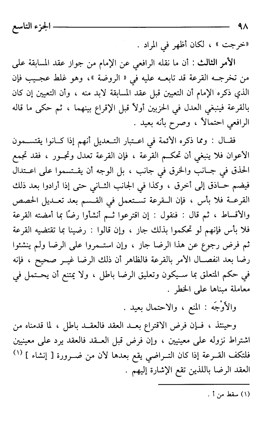 الأمر الثالث: أن ما نقله الرافعي عن الإمام من جواز عقد المسابقة على من تخرجه القرعة قد تابعه عليه في "الروضة"، وهو غلط عجيب فإن الذي ذكره الإمام أن التعيين قبل عقد المسابقة لابد منه، وأن التعيين إن كان بالقرعة فينبغي العدل في الحزبين أولًا قبل الإقراع بينهما، ثم حكى ما قاله الرافعي احتمالًا، وصرح بأنه بعيد.