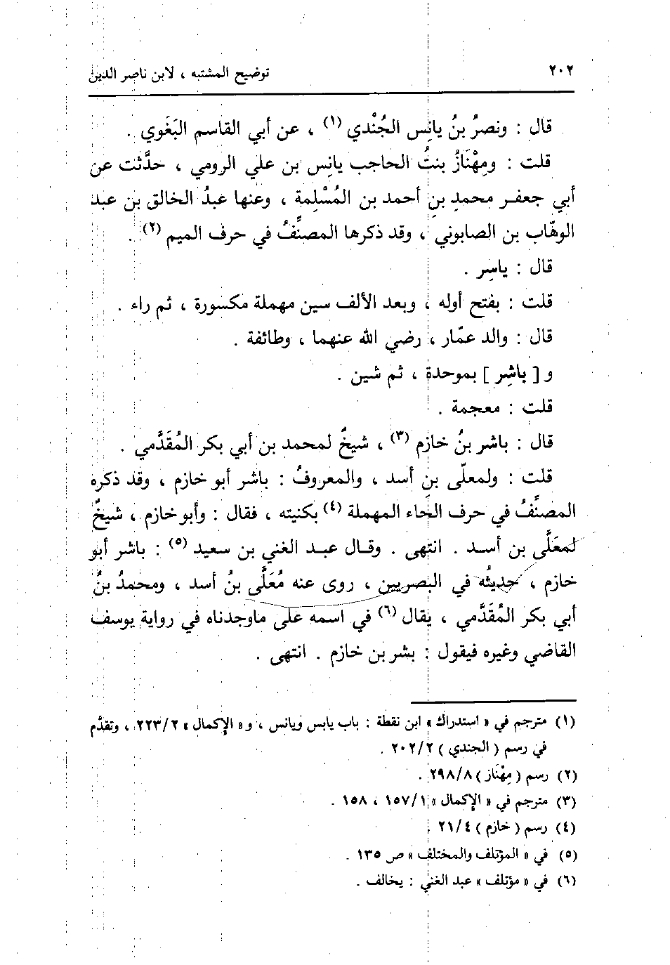قلت: ولمعلى بن أَسد، وَالْمَعْرُوف: بَاشر أَبُو خازم، وَقد ذكره المُصَنّف فِي حرف الْحَاء الْمُهْملَة بكنيته، فَقَالَ: وَأَبُو خازم، شيخ لمعلى بن أَسد. انْتهى. وَقَالَ عبد الْغَنِيّ بن سعيد: بَاشر أَبُو خازم، حَدِيثه فِي الْبَصرِيين، روى عَنهُ مُعلى بن أَسد، وَمُحَمّد بن أبي بكر الْمقدمِي، يُقَال فِي اسْمه على مَا وَجَدْنَاهُ فِي رِوَايَة يُوسُف القَاضِي وَغَيره فَيَقُول: بشر بن خازم. انْتهى.