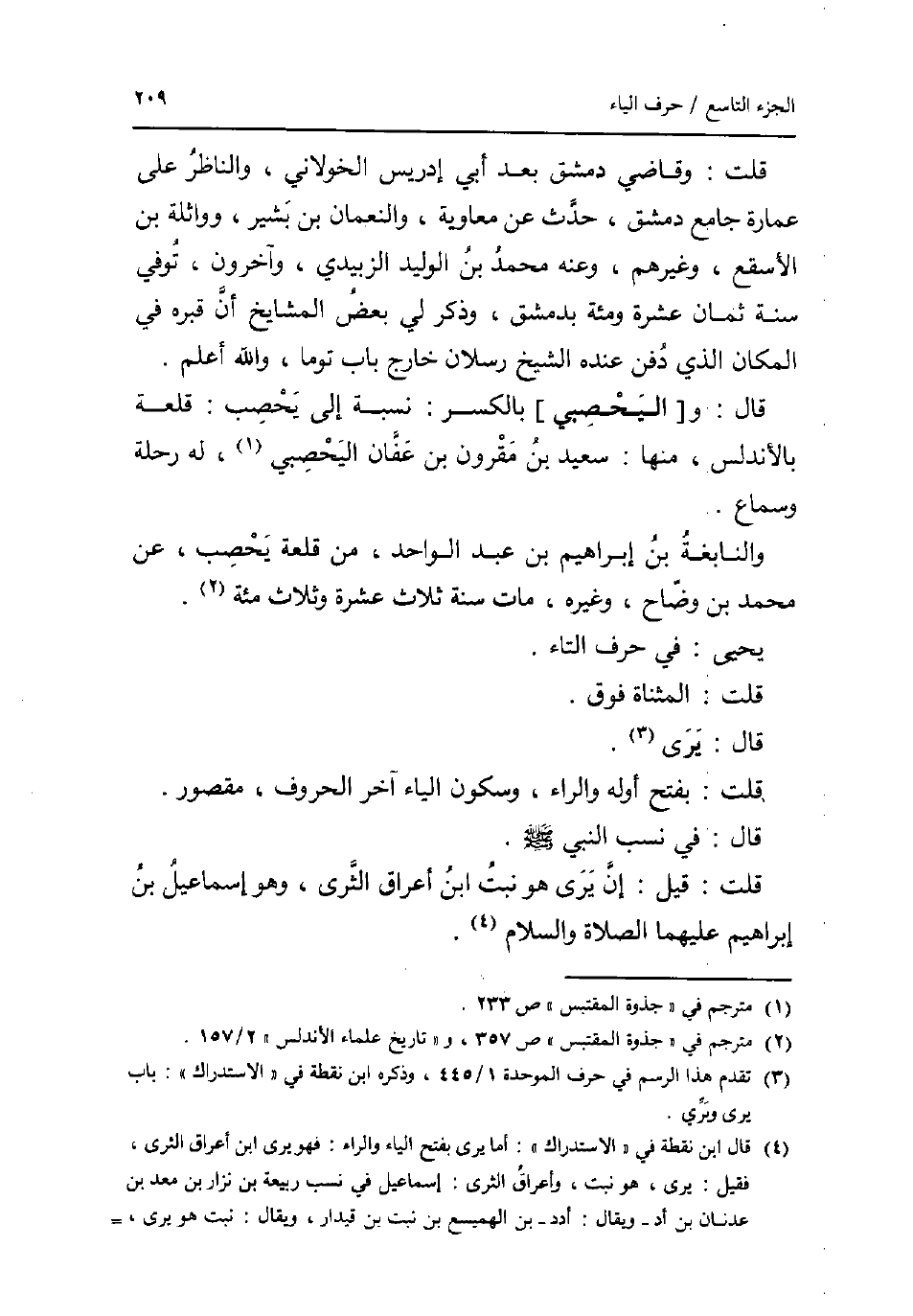 قَالَ: و [اليَحْصِبي] بِالْكَسْرِ: نِسْبَة إِلَى يحصب: قلعة بالأندلس، مِنْهَا: سعيد بن مقرون بن عَفَّان الْيحصبِي، لَهُ رحْلَة وَسَمَاع.