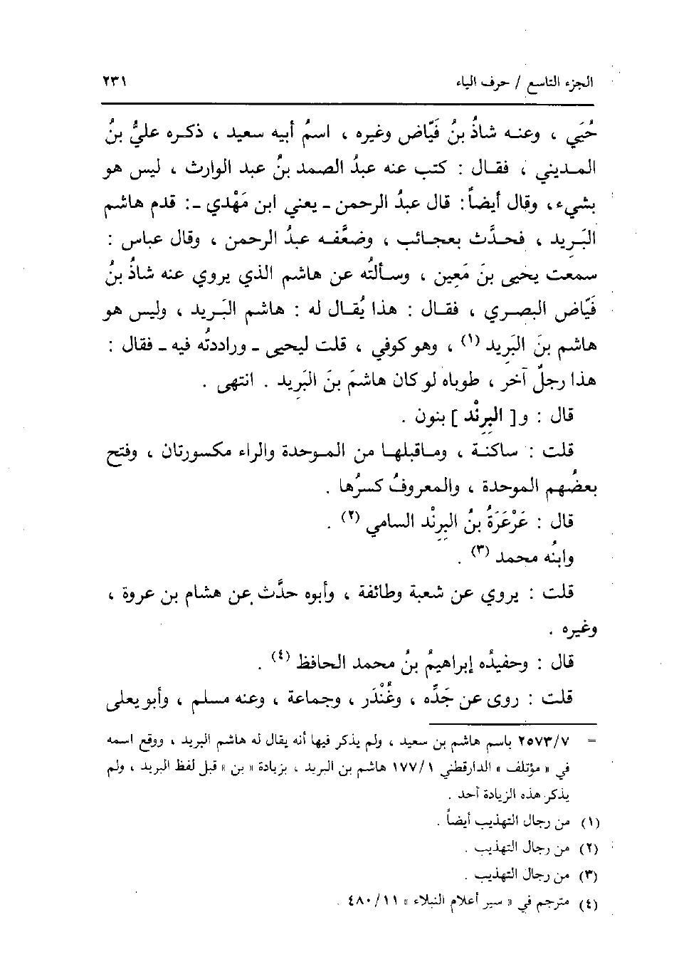 حييّ، وَعنهُ شَاذ بن فياض وَغَيره، اسْم أَبِيه سعيد، ذكره عَليّ بن الْمَدِينِيّ، فَقَالَ: كتب عَنهُ عبد الصَّمد بن عبد الْوَارِث، لَيْسَ هُوَ بِشَيْء، وَقَالَ أَيْضا: قَالَ عبد الرَّحْمَن - يَعْنِي ابْن مهْدي -: قدم هَاشم الْبَرِيد، فَحدث بعجائب، وَضَعفه عبد الرَّحْمَن، وَقَالَ عَبَّاس: سَمِعت يحيى بن معِين، وَسَأَلته عَن هَاشم الَّذِي يروي عَنهُ شَاذ بن فياض الْبَصْرِيّ، فَقَالَ: هَذَا يُقَال لَهُ: هَاشم الْبَرِيد، وَلَيْسَ هُوَ هَاشم بن الْبَرِيد، وَهُوَ كُوفِي، قلت ليحيى - وراددته فِيهِ - فَقَالَ: هَذَا رجل آخر، طوباه لَو كَانَ هَاشم بن الْبَرِيد. انْتهى.