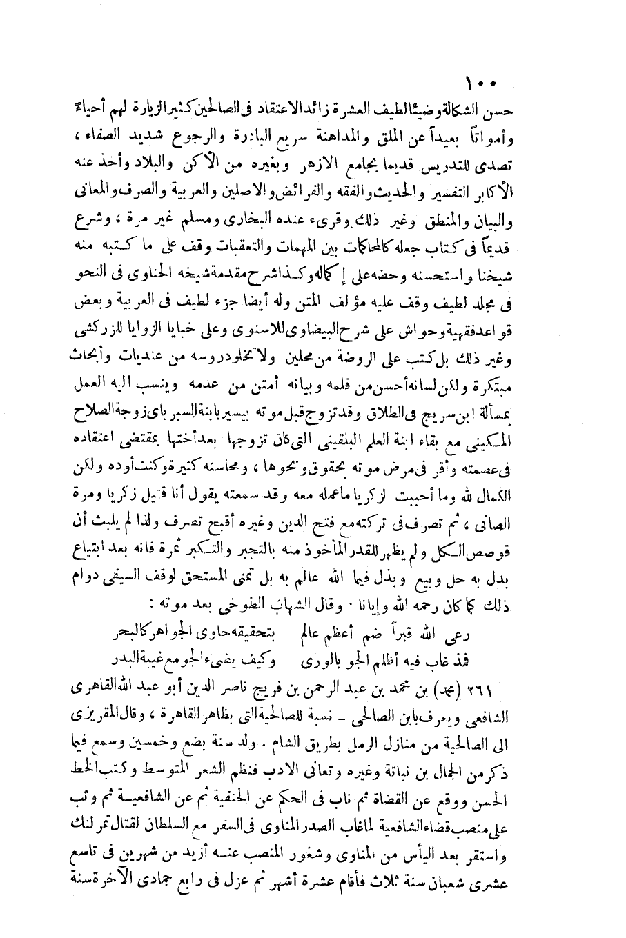 261 - مُحَمَّد بن مُحَمَّد بن عبد الرَّحْمَن بن فريج نَاصِر الدّين أَبُو عبد الله القاهري الشَّافِعِي وَيعرف بِابْن الصَّالِحِي. / نِسْبَة للصالحية الَّتِي بِظَاهِر الْقَاهِرَة، وَقَالَ المقريزي إِلَى الصالحية من منَازِل الرمل بطرِيق الشَّام. ولد سنة بضع وَخمسين وَسمع فِيمَا ذكر من الْجمال بن نَبَاته وَغَيره وتعاني الادب فنظم الشعهر الْمُتَوَسّط وَكتب الْخط الْحسن وَوَقع عَن الْقَضَاء ثمَّ نَاب فِي الحكم عَن الْحَنَفِيَّة ثمَّ عَن الشَّافِعِيَّة ثمَّ وثب على منصب قَضَاء الشَّافِعِيَّة لما غَابَ الصَّدْر الْمَنَاوِيّ فِي السّفر مَعَ السُّلْطَان لقِتَال تمر لنك وَاسْتقر بعد الْيَأْس من الْمَنَاوِيّ وشغور المنصب عَنهُ أَزِيد من شَهْرَيْن فِي تَاسِع عشري شعْبَان سنة ثَلَاث فَأَقَامَ عشرَة أشهر ثمَّ عزل فِي رَابِع جُمَادَى الْآخِرَة سنة