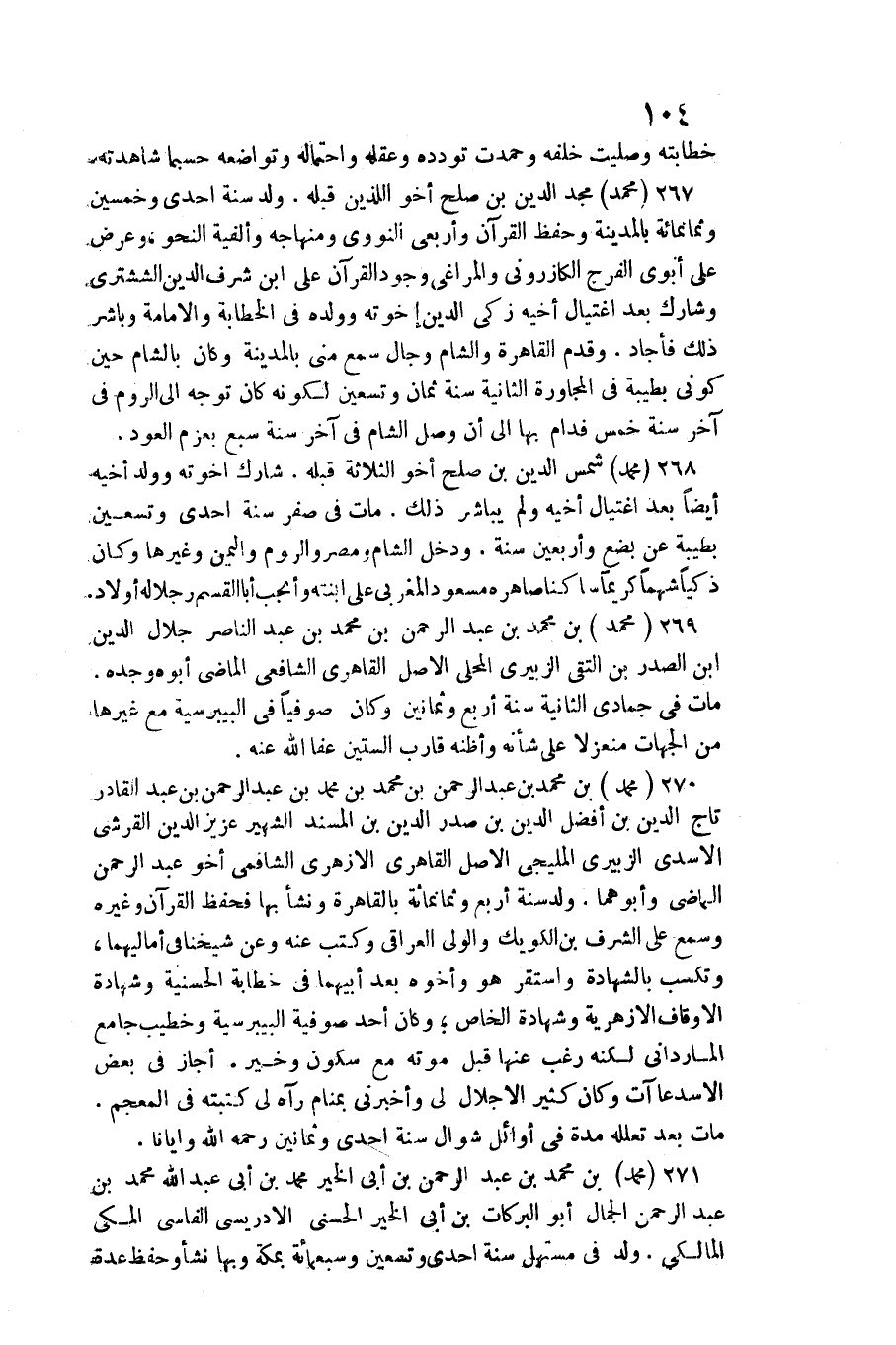 269 - مُحَمَّد بن مُحَمَّد بن عبد الرَّحْمَن بن مُحَمَّد بن عبد النَّاصِر جلال الدّين ابْن صدر بن التقي الزبيرِي الْمحلي الاصل القاهري الشَّافِعِي / الْمَاضِي أَبوهُ وجده. مَاتَ فِي جُمَادَى الثَّانِيَة سنة أَربع وَثَمَانِينَ وَكَانَ صوفيا فِي البيبرسية مَعَ غَيرهَا من الْجِهَات منعزلا على شَأْنه وَأَظنهُ قَارب السِّتين عَفا الله عَنهُ.