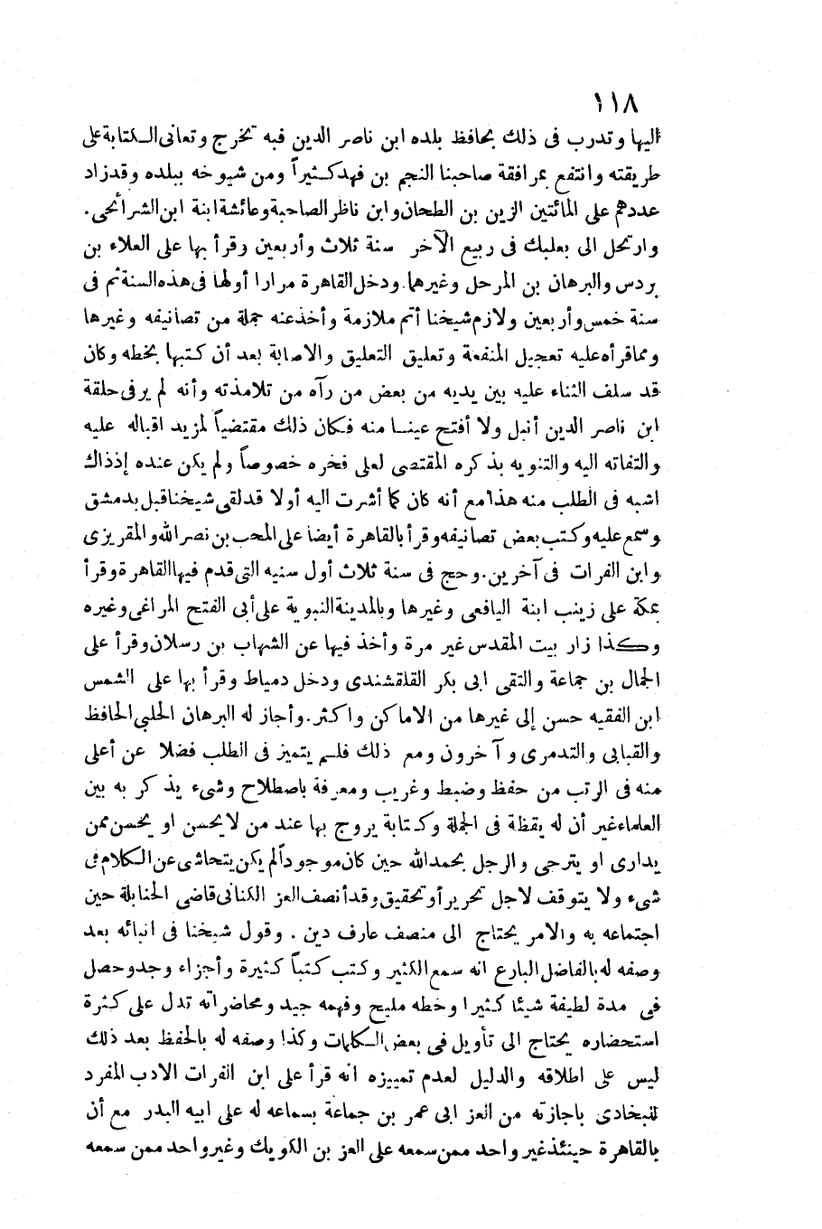 وارتحل إِلَى بلعبك فِي ربيع الآخر سنة ثَلَاث وَأَرْبَعين وَقَرَأَ بهَا على الْعَلَاء بن بردس والبرهان بن المرحل وَغَيرهمَا وَدخل الْقَاهِرَة مرَارًا أَولهَا فِي هَذِه السّنة ثمَّ فِي سنة خمس وَأَرْبَعين ولازم شَيخنَا أتم مُلَازمَة وَأخذ عَنهُ جملَة من تصانيفه وَغَيرهَا وَمِمَّا قَرَأَهُ عَلَيْهِ تَعْجِيل الْمَنْفَعَة وَتَعْلِيق التَّعْلِيق والإصابة بعد أَن كتبهَا بِخَطِّهِ وَكَانَ قد سلف الثَّنَاء عَلَيْهِ بَين يَدَيْهِ من بعض من رَآهُ من تلامذته وَأَنه لم ير فِي حَلقَة ابْن نَاصِر الدّين أنبل وَلَا أفتح عينا مِنْهُ فَكَانَ ذَلِك مقتضيا لمزيد إقباله عَلَيْهِ والتفاته إِلَيْهِ والتنويه بِذكرِهِ الْمُقْتَضِي لعَلي فخره خُصُوصا وَلم يكن عِنْده إِذْ ذَاك أشبه فِي الطّلب مِنْهُ هَذَا مَعَ أَنه كَانَ كَمَا أَشرت إِلَيْهِ أَولا قد لَقِي شَيخنَا قبل بِدِمَشْق وَسمع عَلَيْهِ وَكتب بعض تصانيفه وَقَرَأَ بِالْقَاهِرَةِ أَيْضا على الْمُحب بن نصر الله والمقريزي وَابْن الْفُرَات فِي آخَرين. وَحج فِي سنة ثَلَاث أول سنيه الَّتِي قدم فِيهَا الْقَاهِرَة وَقَرَأَ بِمَكَّة على زَيْنَب ابْنة اليافعي وَغَيرهَا وبالمدينة النَّبَوِيَّة على أبي الْفَتْح المراغي وَغَيره وَكَذَا)