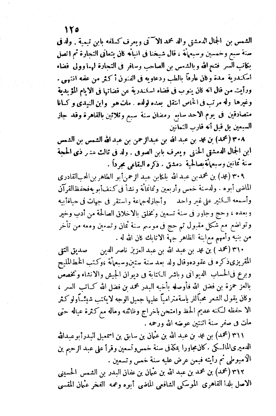 308 - مُحَمَّد بن مُحَمَّد بن عبد الله بن عبد الرَّحْمَن بن عبد الله الشَّمْس بن الشَّمْس بن الْجمال الدِّمَشْقِي الْحَنَفِيّ وَيعرف بِابْن الصُّوفِي. / ولد فِي ثَالِث عشر ذِي الْحجَّة سنة ثَمَانِينَ وَسَبْعمائة)