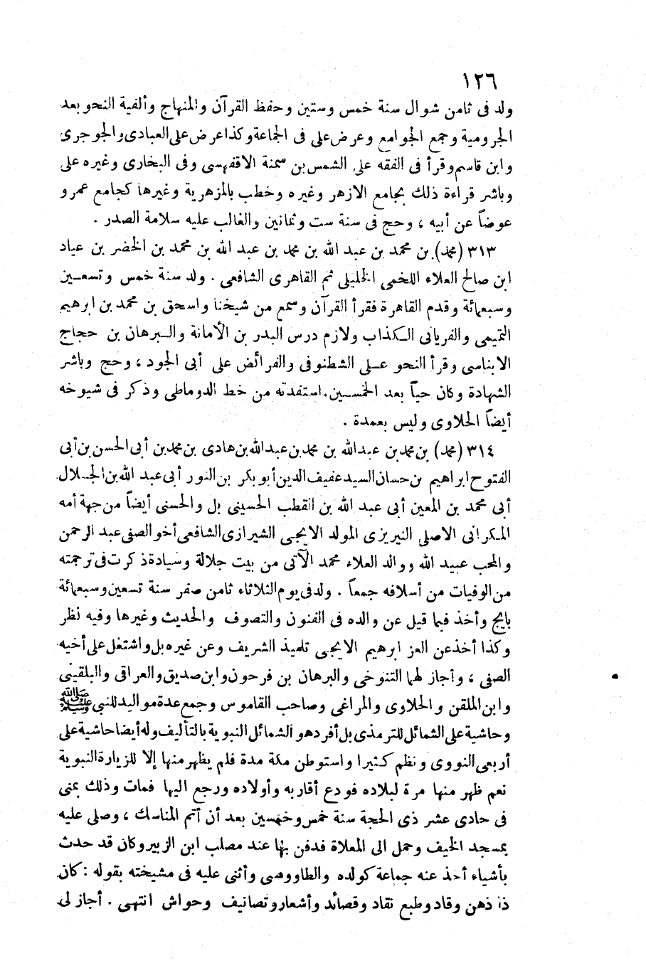 313 - مُحَمَّد بن مُحَمَّد بن عبد الله بن مُحَمَّد بن عبد الله بن مُحَمَّد بن الْخضر بن عياد بن صَالح الْعَلَاء اللَّخْمِيّ الخليلي ثمَّ القاهري الشَّافِعِي. / ولد سنة خمس وَتِسْعين وَسَبْعمائة وَقدم)
