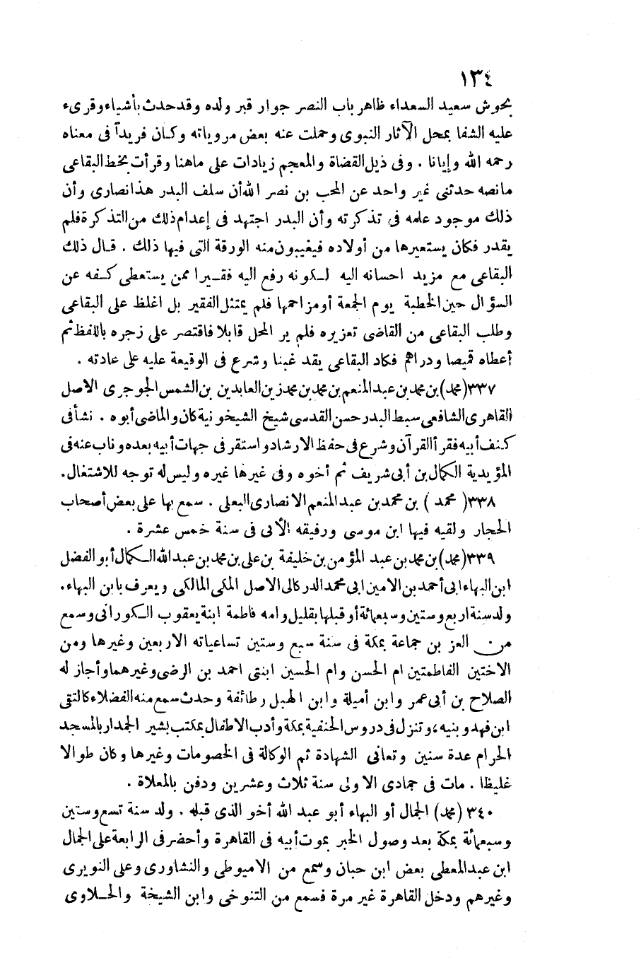 339 - مُحَمَّد بن مُحَمَّد بن عبد الْمُؤمن بن خَليفَة بن عَليّ بن مُحَمَّد بن عبد الله الْكَمَال أَبُو الْفضل بن الْبَهَاء أبي أَحْمد بن الْأمين أبي مُحَمَّد الدركالي الأَصْل الْمَكِّيّ الْمَالِكِي وَيعرف بِابْن الْبَهَاء. / ولد سنة أَربع وَسِتِّينَ وَسَبْعمائة أَو قبلهَا بِقَلِيل وَأمه فَاطِمَة ابْنة يَعْقُوب الكوراني وَسمع)