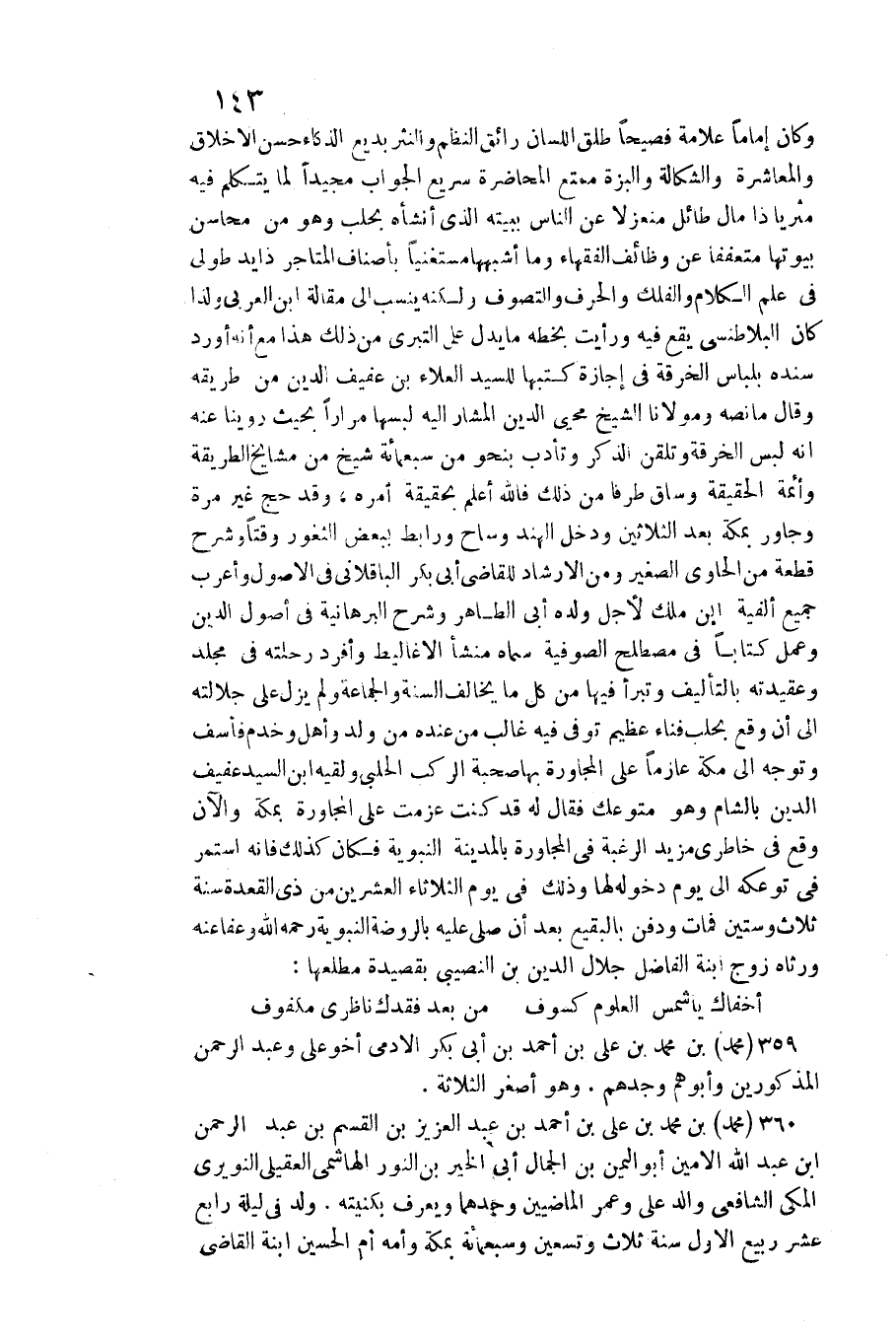 والشكالة وَالْبزَّة ممتع المحاضرة سريع الْجَواب مجيدا لما يتَكَلَّم فِيهِ مثريا ذَا مَال طائل منعزلا عَن النَّاس ببيته الَّذِي أنشأه بحلب وَهُوَ من محَاسِن بيوتها متعففا عَن وظائف الْفُقَهَاء وَمَا أشبههَا مستغنيا بأصناف المتاجل ذَا يَد طولى فِي علم الْكَلَام والفلك والحرف والتصوف وَلكنه ينْسب إِلَى مقَالَة ابْن الْعَرَبِيّ وَلذَا كَانَ البلاطنسي يَقع فِيهِ وَرَأَيْت بِخَطِّهِ مَا يدل على التبري من ذَلِك هَذَا مَعَ أَنه أورد سَنَده بلباس الْخِرْقَة فِي إجَازَة كتبهَا للسَّيِّد الْعَلَاء بن عفيف الدّين من طَرِيقه وَقَالَ مَا نَصه ومولانا الشَّيْخ مُحي الدّين الْمشَار إِلَيْهِ لبسهَا مرَارًا بِحَيْثُ روينَا عَنهُ أَنه لبس الْخِرْقَة وتلقن الذّكر وتأدب بِنَحْوِ من سَبْعمِائة شيخ من مَشَايِخ الطَّرِيقَة وأئمة الْحَقِيقَة وسَاق طرفا من ذَلِك فَالله أعلم بِحَقِيقَة أمره، وَقد حج غير مرّة وجاور بِمَكَّة بعد الثَّلَاثِينَ وَدخل الْهِنْد وساح ورابط بِبَعْض الثغور وقتا وَشرح قِطْعَة من الْحَاوِي الصَّغِير وَمن الْإِرْشَاد للْقَاضِي أبي بكر الباقلاني فِي الْأُصُول وأعرب جَمِيع ألفية ابْن ملك لأجل وَلَده أبي الطَّاهِر وَشرح البرهانية فِي أصُول الدّين وَعمل كتابا فِي مصطلح الصُّوفِيَّة سَمَّاهُ منشأ الأغاليظ وأفرد رحلته فِي مُجَلد وعقيدته بالتأليف وتبرا فِيهَا من كل مَا يُخَالف السّنة وَالْجَمَاعَة وَلم يزل على جلالته إِلَى أَن وَقع بحلب فنَاء عَظِيم توفّي فِيهِ غَالب من عِنْده من ولد وَأهل وخدم فأسف وَتوجه إِلَى مَكَّة عَازِمًا على الْمُجَاورَة بهَا صُحْبَة الركب الْحلَبِي ولقيه ابْن السَّيِّد عفيف الدّين بِالشَّام وَهُوَ متوعك فَقَالَ لَهُ قد كنت عزمت على الْمُجَاورَة بِمَكَّة والآن وَقع فِي خاطري مزِيد الرَّغْبَة فِي الْمُجَاورَة بِالْمَدِينَةِ النَّبَوِيَّة فَكَانَ كَذَلِك فَإِنَّهُ اسْتمرّ فِي توعكه إِلَى يَوْم دُخُوله لَهَا وَذَلِكَ فِي يَوْم الثُّلَاثَاء الْعشْرين من ذِي الْقعدَة سنة ثَلَاث وَسِتِّينَ فَمَاتَ وَدفن بِالبَقِيعِ بعد أَن صلى عَلَيْهِ بالروضة النَّبَوِيَّة رَحمَه الله وَعَفا عَنهُ ورثاه زوج ابْنة الْفَاضِل جلال الدّين بن النصيبي بقصيدة مطْلعهَا: