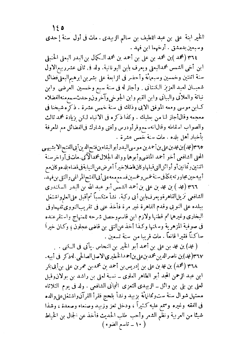 368 - مُحَمَّد بن مُحَمَّد بن عَليّ بن إِدْرِيس بن أَحْمد بن مُحَمَّد بن عمر بن عَليّ بن أبي بكر بن عبد الرَّحْمَن الْمجد أَبُو الطَّاهِر الْعلوِي نِسْبَة لعَلي بن رَاشد بن بولان وَقيل لعَلي بن بلي بن وَائِل الزبيدِيّ التعزي الْيَمَانِيّ الشَّافِعِي. ولد فِي يَوْم الثُّلَاثَاء مستهل شَوَّال سنة سِتّ وَثَمَانمِائَة بزبيد وَنَشَأ بلحج فَقَرَأَ الْقُرْآن واشتغل على وَالِده فِي الْفِقْه وَغَيره وَسمع عَلَيْهِ كثيرا، وَدخل تعز وزبيد وَصَنْعَاء وصعدة، وشذا شَيْئا من الْعَرَبيَّة ونظم الشّعْر وَأحب طلب الحَدِيث فَأخذ عَن الْجمال بن الْخياط