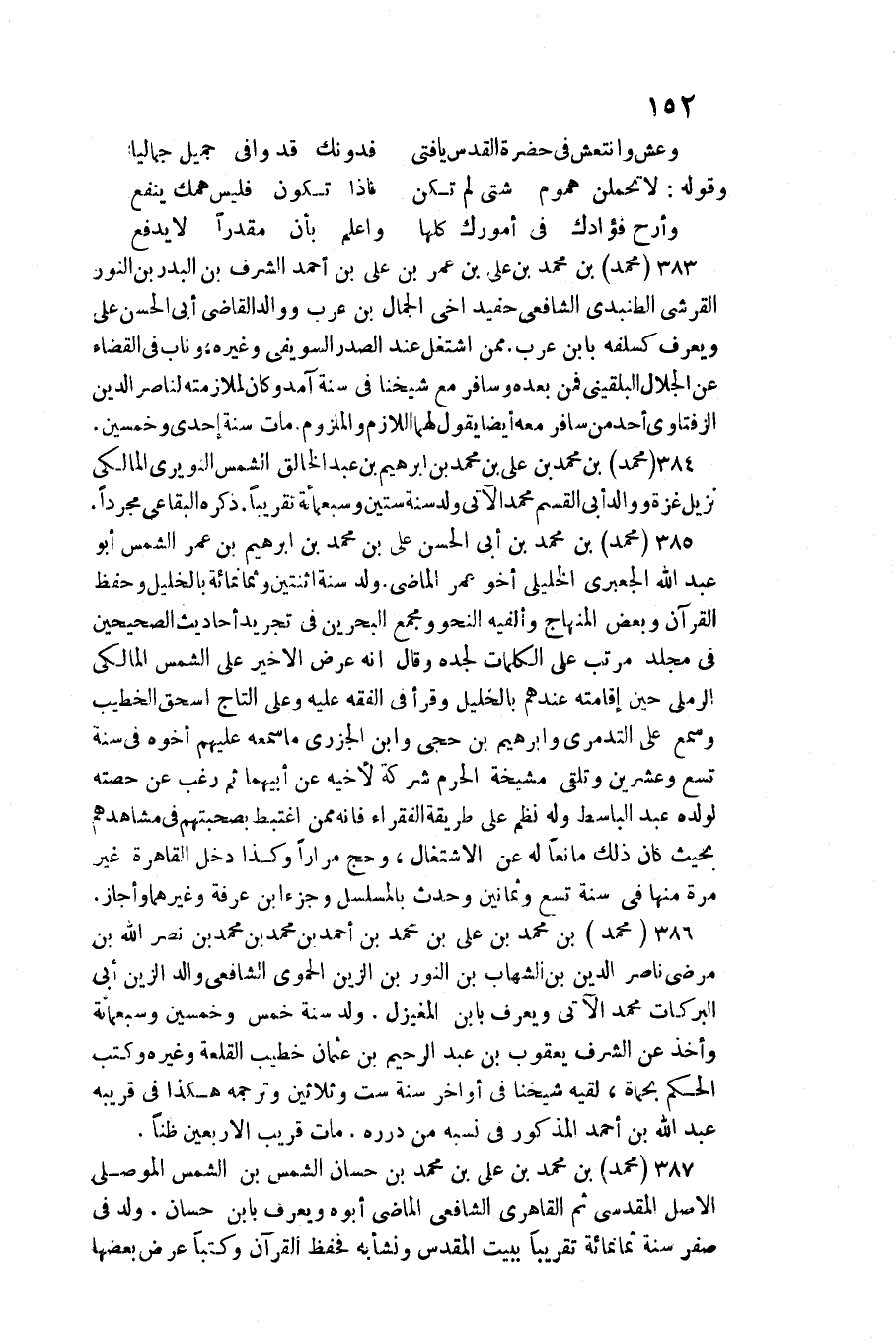 387 - مُحَمَّد بن مُحَمَّد بن عَليّ بن مُحَمَّد بن حسان الشَّمْس بن الشَّمْس الْموصِلِي الأَصْل الْمَقْدِسِي ثمَّ القاهري الشَّافِعِي الْمَاضِي أَبوهُ وَيعرف بِابْن حسان. / ولد فِي صفر سنة ثَمَانمِائَة تَقْرِيبًا بِبَيْت الْمُقَدّس وَنَشَأ بِهِ فحفظ الْقُرْآن وكتبا عرض بَعْضهَا