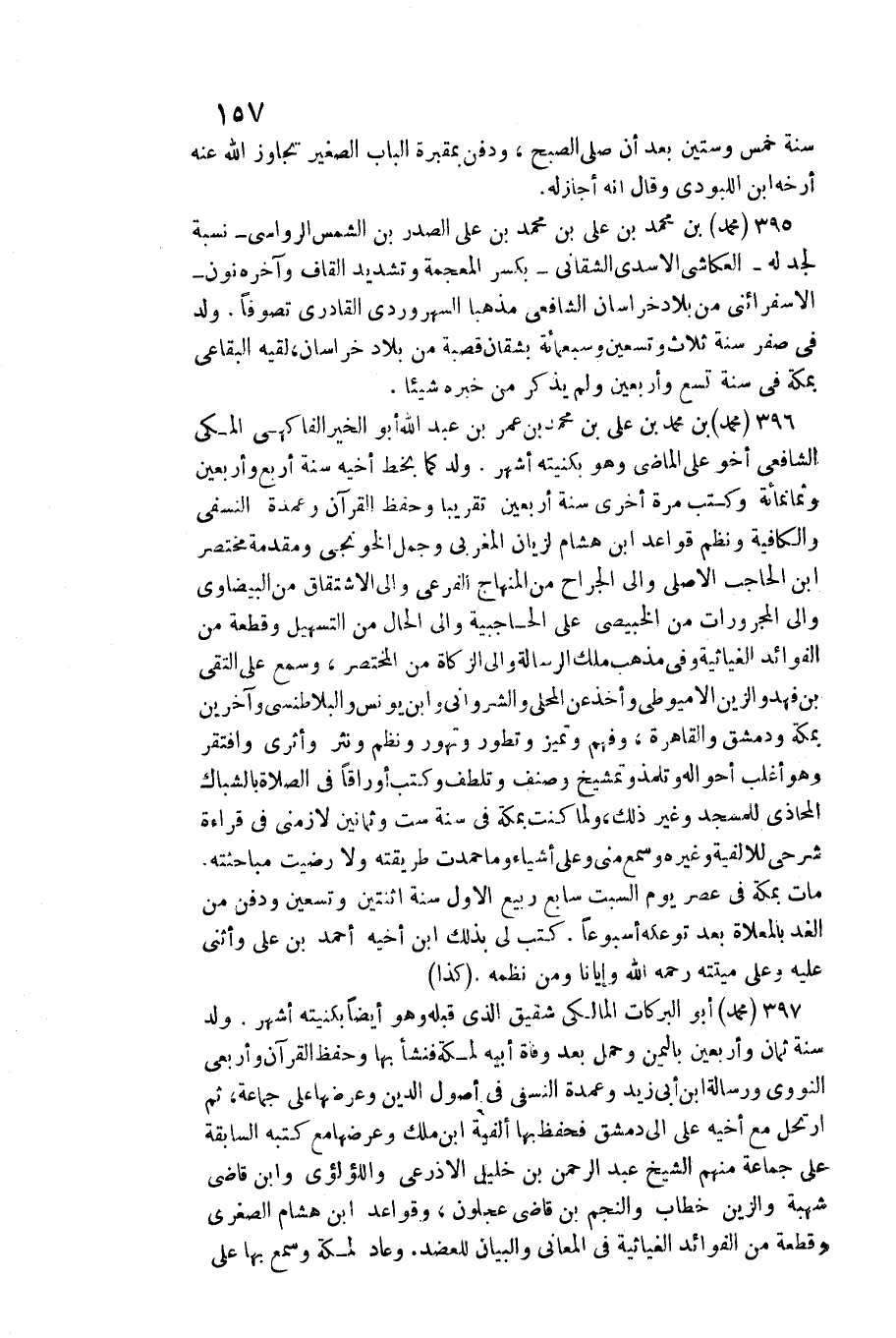 395 - مُحَمَّد بن مُحَمَّد بن عَليّ بن مُحَمَّد بن عَليّ الصَّدْر بن الشَّمْس الرواسِي نِسْبَة لجد لَهُ الْعُكَّاشِي الْأَسدي الشقاني كسر الْمُعْجَمَة وَتَشْديد الْقَاف وَآخره نون الإسفرائني من بِلَاد خُرَاسَان الشَّافِعِي مذهبا السهروردي القادري تصوفا. / ولد فِي صفر سنة ثَلَاث وَتِسْعين)