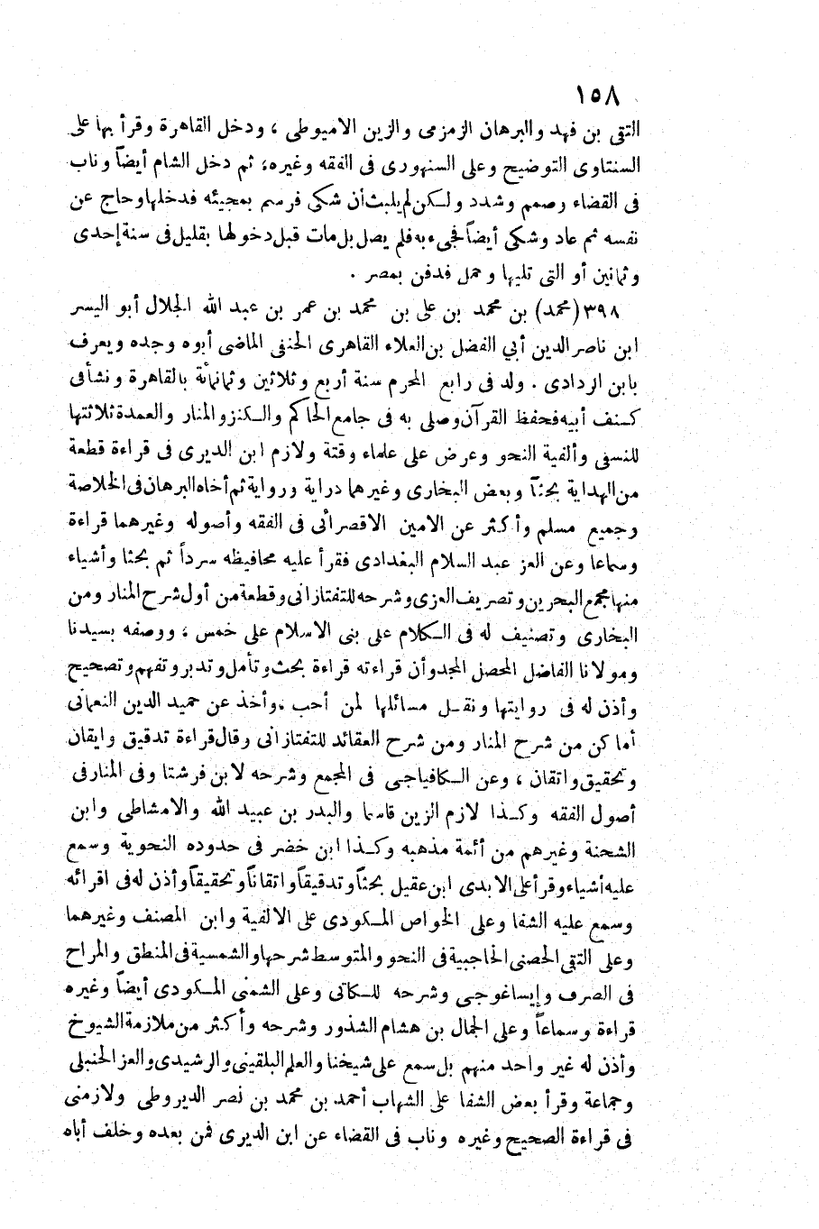 398 - مُحَمَّد بن مُحَمَّد بن عَليّ بن مُحَمَّد بن عمر بن عبد الله الْجلَال أَبُو الْيُسْر بن نَاصِر الدّين أبي الْفضل بن الْعَلَاء القاهري الْحَنَفِيّ الْمَاضِي أَبوهُ وجده وَيعرف بِابْن الردادي. / ولد فِي رَابِع الْمحرم سنة أَربع وَثَلَاثِينَ وَثَمَانمِائَة بِالْقَاهِرَةِ وَنَشَأ فِي كنف أَبِيه فحفظ الْقُرْآن وَصلى بِهِ فِي جَامع الْحَاكِم والكنز والمنار والعمدة ثلاثتها للنسفي وألفية النَّحْو وَعرض على عُلَمَاء وقته ولازم ابْن الديري فِي قِرَاءَة قِطْعَة من الْهِدَايَة بحثا وَبَعض البُخَارِيّ وَغَيرهمَا دراية وَرِوَايَة ثمَّ أَخَاهُ الْبُرْهَان فِي الْخُلَاصَة وَجَمِيع مُسلم وَأكْثر عَن الْأمين الأقصرائي فِي الْفِقْه وأصوله وَغَيرهمَا قِرَاءَة وسماعا وَعَن الْعِزّ عبد السَّلَام الْبَغْدَادِيّ فَقَرَأَ عَلَيْهِ محافيظه سردا ثمَّ بحثا وَأَشْيَاء مِنْهَا مجمع الْبَحْرين وتصريف الْعزي وَشَرحه للتفتازاني وَقطعَة من أول شرح الْمنَار وَمن البُخَارِيّ وتصنيف لَهُ فِي الْكَلَام على بني الْإِسْلَام على خمس، وَوَصفه بسيدنا ومولانا الْفَاضِل المحصل الْمجد وَأَن قِرَاءَته قِرَاءَة بحث وَتَأمل وتدبر وتفهم وَتَصْحِيح وَأذن لَهُ فِي رِوَايَتهَا وَنقل مسائلها لمن أحب، وَأخذ عَن حميد الدّين النعماني أَمَاكِن من شرح الْمنَار وَمن شرح العقائد للتفتازاني وَقَالَ قِرَاءَة تدقيق وإيقان وَتَحْقِيق وإتقان، وَعَن الكافياجي فِي الْمجمع وَشَرحه لِابْنِ فرشتا وَفِي الْمنَار فِي أصُول الْفِقْه وَكَذَا لَازم الزين قاسما والبدر بن عبيد الله والأمشاطي وَابْن الشّحْنَة وَغَيرهم من أَئِمَّة مذْهبه وَكَذَا ابْن خضر فِي حُدُوده النحوية وَسمع عَلَيْهِ أَشْيَاء وَقَرَأَ على الأبدي ابْن عقيل بحثا وتدقيقا وإتقانا وتحقيقا وَأذن لَهُ فِي إقرائه وَسمع عَلَيْهِ الشفا وعَلى الْخَواص المكودي على الألفية وَابْن المُصَنّف وَغَيرهمَا وَعلي التقي الحصني الحاجبية فِي النَّحْو والمتوسط شرحها والشمسية فِي الْمنطق والمراح فِي الصّرْف وإيساغوجي وَشَرحه وَأكْثر من مُلَازمَة الشُّيُوخ وَأذن لَهُ غيرواحد مِنْهُم بل سمع على شَيخنَا وَالْعلم البُلْقِينِيّ والرشيدي والعز الْحَنْبَلِيّ وَجَمَاعَة وَقَرَأَ بعض الشفا على الشهَاب أَحْمد بن مُحَمَّد بن نصر الديروطي ولازمني فِي قِرَاءَة الصَّحِيح وَغَيره وناب فِي الْقَضَاء عَن ابْن الديري فَمن بعده وَخلف أَبَاهُ