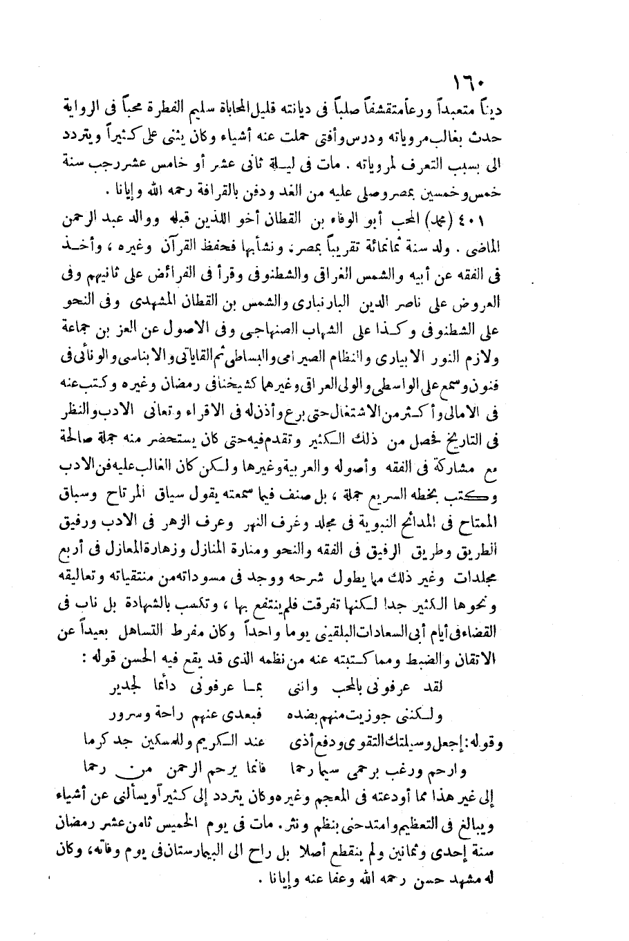 401 - مُحَمَّد الْمُحب أَبُو الْوَفَاء بن الْقطَّان أَخُو اللَّذين قبله ووالد عبد الرَّحْمَن / الْمَاضِي. ولد سنة ثَمَانمِائَة تَقْرِيبًا بِمصْر، وَنَشَأ بهَا فحفظ الْقُرْآن وَغَيره، وَأخذ فِي الْفِقْه عَن أَبِيه وَالشَّمْس الغراقي والشطنوفي وَقَرَأَ فِي الْفَرَائِض على ثانيهم وَفِي الْعرُوض على نَاصِر الدّين البارنباري وَالشَّمْس بن الْقطَّان المشهدي وَفِي النَّحْو على الشطنوفي وَكَذَا على الشهَاب الصنهاجي وَفِي الْأُصُول عَن الْعِزّ بن جمَاعَة ولازم النُّور الإبياري والنظام الصيرامي والبساطي ثمَّ القاياتي والأبناسي ولاونائي فِي فنون وَسمع على الوَاسِطِيّ وَالْوَلِيّ الْعِرَاقِيّ وَغَيرهمَا كشيخنا فِي رَمَضَان وَغَيره وَكتب عَنهُ فِي الأمالي وَأكْثر من الِاشْتِغَال حَتَّى برع وَأذن لَهُ فِي الإقراء وتعانى الْأَدَب وَالنَّظَر فِي التَّارِيخ فَحصل من ذَلِك الْكثير وَتقدم فِيهِ حَتَّى كَانَ يستحضر مِنْهُ جملَة صَالِحَة مَعَ مُشَاركَة فِي الْفِقْه وأصوله والعربية وَغَيرهَا وَلَكِن كَانَ الْغَالِب عَلَيْهِ فن الْأَدَب وَكتب بِخَطِّهِ السَّرِيع جملَة، بل صنف فِيمَا سمعته يَقُول سِيَاق المرتاح وسباق الممتاح فِي المدائح النَّبَوِيَّة فِي مُجَلد وغرف النَّهر وَعرف الزهر فِي الْأَدَب ورفيق الطَّرِيق وَطَرِيق الرفيق فِي الْفِقْه والنحو ومنارة الْمنَازل وزهارة المعازل فِي أَربع مجلدات وَغير ذَلِك مِمَّا يطول شَرحه وَوجد فِي مسوداته من منتقياته وتعاليقه وَنَحْوهَا الْكثير جدا لَكِنَّهَا تَفَرَّقت فَلم ينْتَفع بهَا، وتكسب بِالشَّهَادَةِ بل نَاب فِي الْقَضَاء فِي أَيَّام أبي السعادات البُلْقِينِيّ يَوْمًا وَاحِدًا وَكَانَ مفرط التساهل بَعيدا عَن الإتقان والضبط وَمِمَّا كتبته عَنهُ من نظمه الَّذِي قد يَقع فِيهِ الْحسن قَوْله: