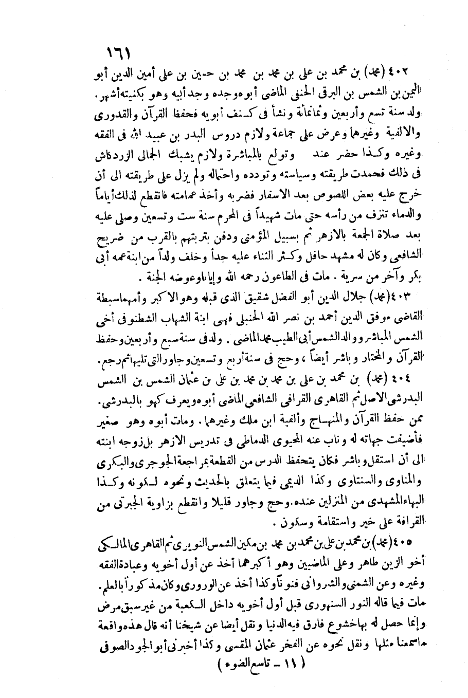403 - مُحَمَّد جلال الدّين أَبُو الْفضل شَقِيق الَّذِي قبله وَهُوَ الْأَكْبَر وأمهما سبطة القَاضِي موفق الدّين أَحْمد بن نصر الله الْحَنْبَلِيّ فَهِيَ ابْنة الشهَاب الشطنوفي أخي الشَّمْس الْمُبَاشر ووالد الشَّمْس أبي الطّيب مُحَمَّد الْمَاضِي. / ولد فِي سنة سبع وَأَرْبَعين وَحفظ الْقُرْآن وَالْمُخْتَار وباشر أَيْضا، وَحج فِي سنة أَربع وَتِسْعين وجاور الَّتِي تَلِيهَا ثمَّ رَجَعَ.
