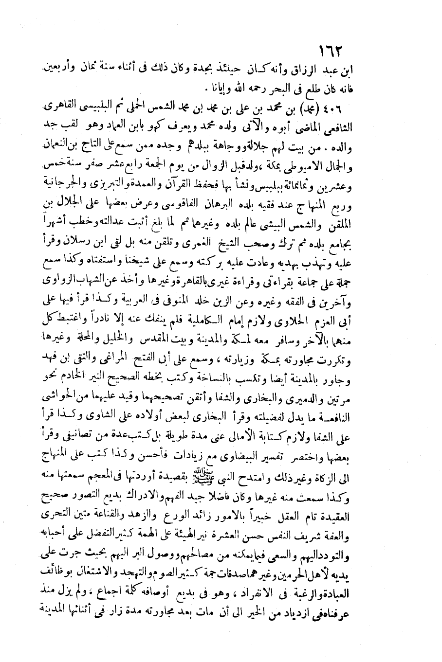 406 - مُحَمَّد بن مُحَمَّد بن عَليّ بن مُحَمَّد بن مُحَمَّد الشَّمْس الحملي ثمَّ البلبيسي القاهري الشَّافِعِي الْمَاضِي أَبوهُ والآتي وَلَده مُحَمَّد وَيعرف كَهُوَ بِابْن الْعِمَاد / وَهُوَ لقب جد وَالِده. من بَيت لَهُم جلالة ووجاهة ببلدهم وجده مِمَّن سمع على التَّاج بن النُّعْمَان وَالْجمال الأميوطي بِمَكَّة، ولد قبل الزَّوَال من يَوْم الْجُمُعَة رَابِع عشر صفر سنة خمس وَعشْرين وَثَمَانمِائَة ببلبيس وَنَشَأ بهَا فحفظ الْقُرْآن والعمدة والتبريزي والجرجانية وَربع الْمِنْهَاج عِنْد فَقِيه بَلَده الْبُرْهَان الفاقوسي وَعرض بَعْضهَا على الْجلَال بن الملقن وَالشَّمْس البيشي عَالم بَلَده وَغَيرهمَا ثمَّ لما بلغ أثبت عَدَالَته وخطب أشهرا بِجَامِع بَلَده ثمَّ ترك وَصَحب الشَّيْخ الغمري وتلقن مِنْهُ بل لَقِي ابْن رسْلَان وَقَرَأَ عَلَيْهِ وتهذب بهديه وعادت عَلَيْهِ بركته وَسمع على شَيخنَا واستفتاه وَكَذَا سمع جملَة على جمَاعَة بِقِرَاءَتِي وَقِرَاءَة غَيْرِي بِالْقَاهِرَةِ وَغَيرهَا وَأخذ عَن الشهَاب الزواوي وَآخَرين فِي الْفِقْه وَغَيره وَعَن الزين خلد المنوفي فِي الْعَرَبيَّة وَكَذَا قَرَأَ فِيهَا على أبي الْعَزْم الحلاوي ولازم إِمَام الكاملية فَلم يَنْفَكّ عَنهُ إِلَّا نَادرا واغتبط كل مِنْهُمَا بِالْآخرِ وسافر مَعَه لمَكَّة وَالْمَدينَة وَبَيت الْمُقَدّس والخليل والمحلة وَغَيرهَا وتكررت مجاورته بِمَكَّة وزيارته، وَسمع على أبي الْفَتْح المراغي والتقى بن فَهد وجاور بِالْمَدِينَةِ أَيْضا وتكسب بالنساخة وَكتب بِخَطِّهِ الصَّحِيح النير الْخَادِم نَحْو مرَّتَيْنِ والدميري وَالْبُخَارِيّ والشفا وأتقن تصحيحهما وَقيد عَلَيْهِمَا من الْحَوَاشِي النافعة مَا يدل لفضيلته وَقَرَأَ البُخَارِيّ لبَعض أَوْلَاده على الشاوي وَكَذَا قَرَأَ على الشفا ولازم كِتَابَة الأمالي عني مُدَّة طَوِيلَة بل كتب عدَّة من تصانيفي وَقَرَأَ بَعْضهَا وَاخْتصرَ تَفْسِير الْبَيْضَاوِيّ مَعَ زيادات فَأحْسن وَكَذَا كتب على الْمِنْهَاج إِلَى الزَّكَاة وَغير ذَلِك وامتدح النَّبِي صلى الله عَلَيْهِ وَسلم بقصيدة أوردتها فِي المعجم سَمعتهَا مِنْهُ وَكَذَا سَمِعت مِنْهُ غَيرهَا وَكَانَ فَاضلا جيد الْفَهم والإدراك بديع التَّصَوُّر صَحِيح العقيدة تَامّ الْعقل خَبِيرا بالأمور زَائِد الْوَرع والزهد والقناعة متين التَّحَرِّي والعفة شرِيف النَّفس حسن الْعشْرَة نير الْهَيْئَة على الهمة)