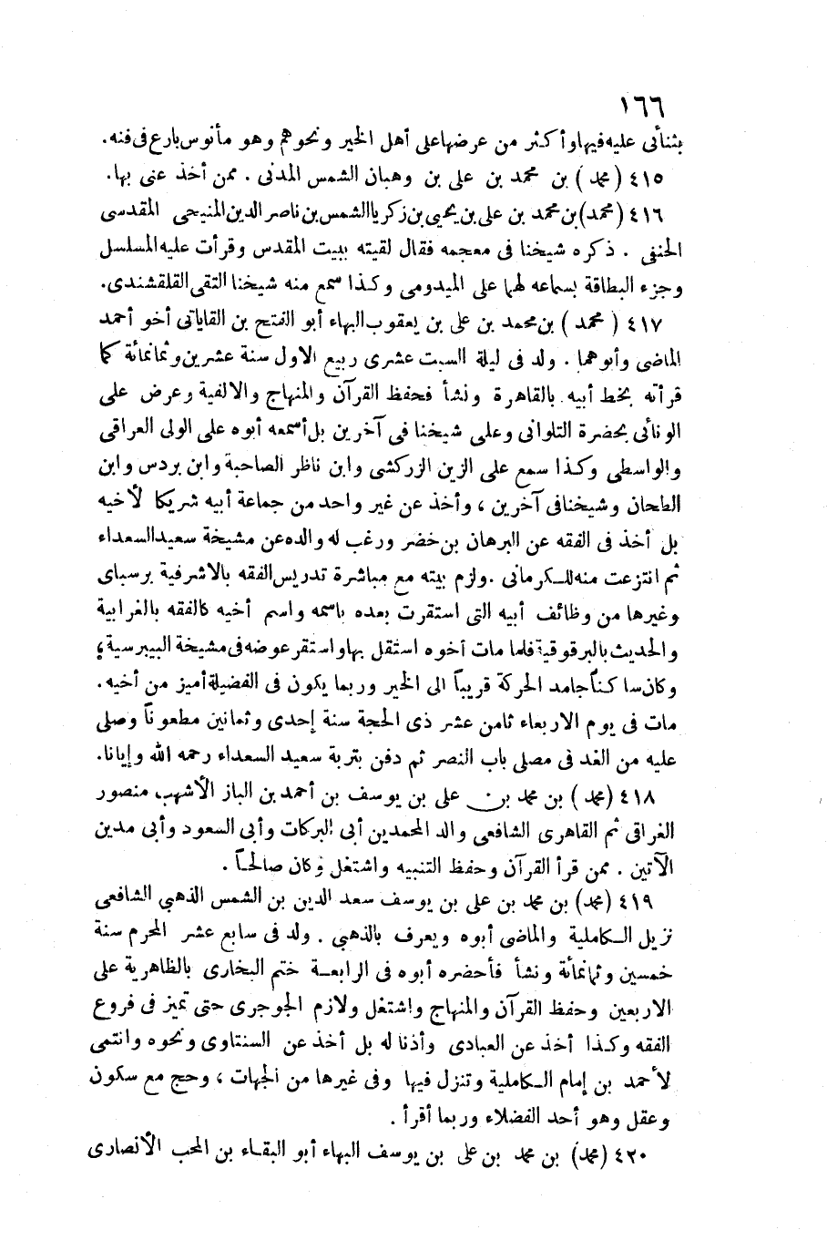 416 - مُحَمَّد بن مُحَمَّد بن عَليّ بن يحيى بن زَكَرِيَّا الشَّمْس بن نَاصِر الدّين المنيحي الْمَقْدِسِي الْحَنَفِيّ. / ذكره شَيخنَا فِي مُعْجَمه فَقَالَ لَقيته بِبَيْت الْمُقَدّس وقرأت عَلَيْهِ المسلسل وجزء البطاقة بِسَمَاعِهِ لَهما على الْمَيْدُومِيُّ وَكَذَا سمع مِنْهُ شَيخنَا التقي القلقشندي.