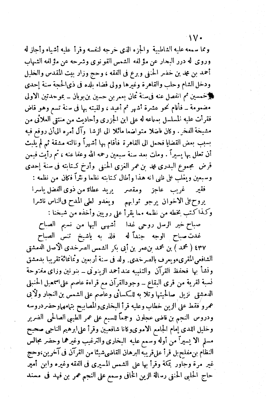 وَمِمَّا سَمعه عَلَيْهِ الشاطبية والجزء الَّذِي خرجه لنَفسِهِ وَقَرَأَ عَلَيْهِ أَشْيَاء وَأَجَازَ لَهُ وروى لَهُ دُرَر الْبحار عَن مُؤَلفه الشَّمْس القونوي وَشَرحه عَن مُؤَلفه الشهَاب أَحْمد بن مُحَمَّد بن خضر الْحَنَفِيّ وبرع فِي الْفِقْه، وَحج وزار بَيت الْمُقَدّس والخليل وَدخل الشَّام وحلب والقاهرة وَغَيرهَا وَولي قَضَاء بَلَده فِي ذِي الْحجَّة سنة إِحْدَى وَخمسين ثمَّ انْفَصل عَنهُ فِي سنة ثَمَان بعمر بن حُسَيْن بن بوبان بموحدتين الأولى مَضْمُومَة فَأَقَامَ نَحْو عشرَة أشهر ثمَّ أُعِيد، ولقيته بهَا فِي سنة تسع وَهُوَ قَاض فَقَرَأت عَلَيْهِ المسلسل بِسَمَاعِهِ لَهُ على ابْن الْجَزرِي وَأَحَادِيث من منتقى العلائي من مشيخة الْفَخر. وَكَانَ فَاضلا متواضعا مائلا إِلَى الرشا وَآل أمره إِلَى أَن روفع فِيهِ بِسَبَب بعض القضايا فَحمل إِلَى الْقَاهِرَة فَأَقَامَ بهَا أشهرا ونالته مشقة ثمَّ لم يلبث أَن تعلل بهَا يَسِيرا. وَمَات بعد سنة سبعين رَحمَه الله وَعَفا عَنهُ، ثمَّ رَأَيْت فِيمَن قرض مَجْمُوع البدري مُحَمَّد بن عمر الْغَزِّي الْحَنَفِيّ وأرخ كِتَابَته فِي سنة إِحْدَى وَسبعين ويغلب على ظَنِّي أَنه هَذَا وَأطَال كِتَابَته نظما ونثرا فَكَانَ من نظمه:)