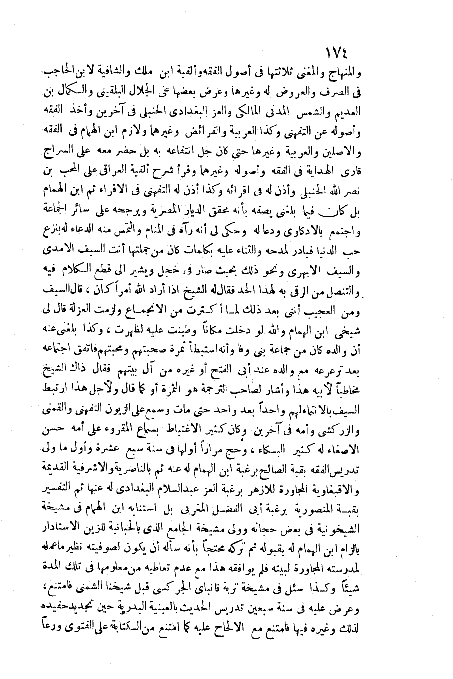 والأصلين والعربية وَغَيرهَا حَتَّى كَانَ جلّ انتفاعه بِهِ بل حضر مَعَه على السراج قارى الْهِدَايَة فِي الْفِقْه وأصوله وَغَيرهمَا وَقَرَأَ شرح ألفية الْعِرَاقِيّ على الْمُحب بن نصر الله الْحَنْبَلِيّ وَأذن لَهُ فِي إقرائه وَكَذَا أذن لَهُ التفهني فِي الإقراء ثمَّ ابْن الْهمام بل كَانَ فِيمَا بَلغنِي يصفه بِأَنَّهُ مُحَقّق الديار المصرية ويرجحه على سَائِر الْجَمَاعَة وَاجْتمعَ بالأدكاوي ودعا لَهُ وَحكى لي أَنه رَآهُ فِي الْمَنَام وَالْتمس مِنْهُ الدُّعَاء لَهُ بِنَزْع حب الدُّنْيَا فبادر لمدحه وَالثنَاء عَلَيْهِ بِكَلِمَات كَانَ من جُمْلَتهَا أَنْت السَّيْف الأمدي وَالسيف الْأَبْهَرِيّ وَنَحْو ذَلِك بِحَيْثُ صَار فِي خجل وَيُشِير إِلَى قطع الْكَلَام فِيهِ والتنصل من الرقي بِهِ لهَذَا الْحَد فَقَالَ لَهُ الشَّيْخ إِذا أَرَادَ الله أمرا كَانَ، قَالَ السَّيْف وَمن العجيب أنني بعد ذَلِك لما أكثرت من الانجماع ولزمت الْعُزْلَة قَالَ لي شَيْخي ابْن الْهمام وَالله لَو دخلت مَكَانا وطينت عَلَيْهِ لظهرت، وَكَذَا بَلغنِي عَنهُ أَن وَالِده كَانَ من جمَاعَة بني وفا وَأَنه استبطأ ثَمَرَة صحبتهم ومحبتهم فاتفق اجتماعه بعد ترعرعه مَعَ وَالِده عِنْد أبي الْفَتْح أَو غَيره من آل بَيتهمْ فَقَالَ ذَاك الشَّيْخ مُخَاطبا لِأَبِيهِ هَذَا وَأَشَارَ لصَاحب التَّرْجَمَة هُوَ الثَّمَرَة أَو كَمَا قَالَ وَلأَجل هَذَا ارْتبط السَّيْف بالانتماء لَهُم وَاحِدًا بعد وَاحِد حَتَّى مَاتَ وَسمع على الزيون التفهني والقمني وَالزَّرْكَشِيّ وَأمه فِي آخَرين وَكَانَ كثير الِاغْتِبَاط بِسَمَاع المقروء على أمه حسن الإصغاء لَهُ كثير الْبكاء، وَحج مرَارًا أَولهَا فِي سنة سبع عشرَة وَأول مَا ولي تدريس الْفِقْه بقبة الصَّالح برغبة ابْن الْهمام لَهُ عَنهُ ثمَّ بالناصرية والأشرفية الْقَدِيمَة والأقبغاوية المجاوية للأزهر برغبة الْعِزّ عبد السَّلَام الْبَغْدَادِيّ لَهُ عَنْهَا ثمَّ التَّفْسِير بقبة المنصورية برغبة أبي الْفضل المغربي بل استنابه ابْن الْهمام فِي مشيخة الشيخونية فِي بعض حجاته وَولي مشيخة الْجَامِع الَّذِي بالحبانية للزين الاستادار بإلزام ابْن الْهمام لَهُ بقبوله ثمَّ تَركه محتجا بِأَنَّهُ سَأَلَهُ أَن يكون لصوفيته نَظِير مَا عمله لمدرسته الْمُجَاورَة لبيته فَلم يُوَافقهُ هَذَا مَعَ عدم تعاطيه من معلومها فِي تِلْكَ الْمدَّة شَيْئا وَكَذَا سُئِلَ فِي مشيخة تربة قانباي الجركسي قبل شَيخنَا الشمني فَامْتنعَ، وَعرض عَلَيْهِ فِي سنة سبعين تدريس الحَدِيث بالعينية البدرية حِين تَجْدِيد حفيده لذَلِك وَغَيره فِيهَا فَامْتنعَ مَعَ الإلحاح عَلَيْهِ كَمَا امْتنع من الْكِتَابَة على الْفَتْوَى ورعا