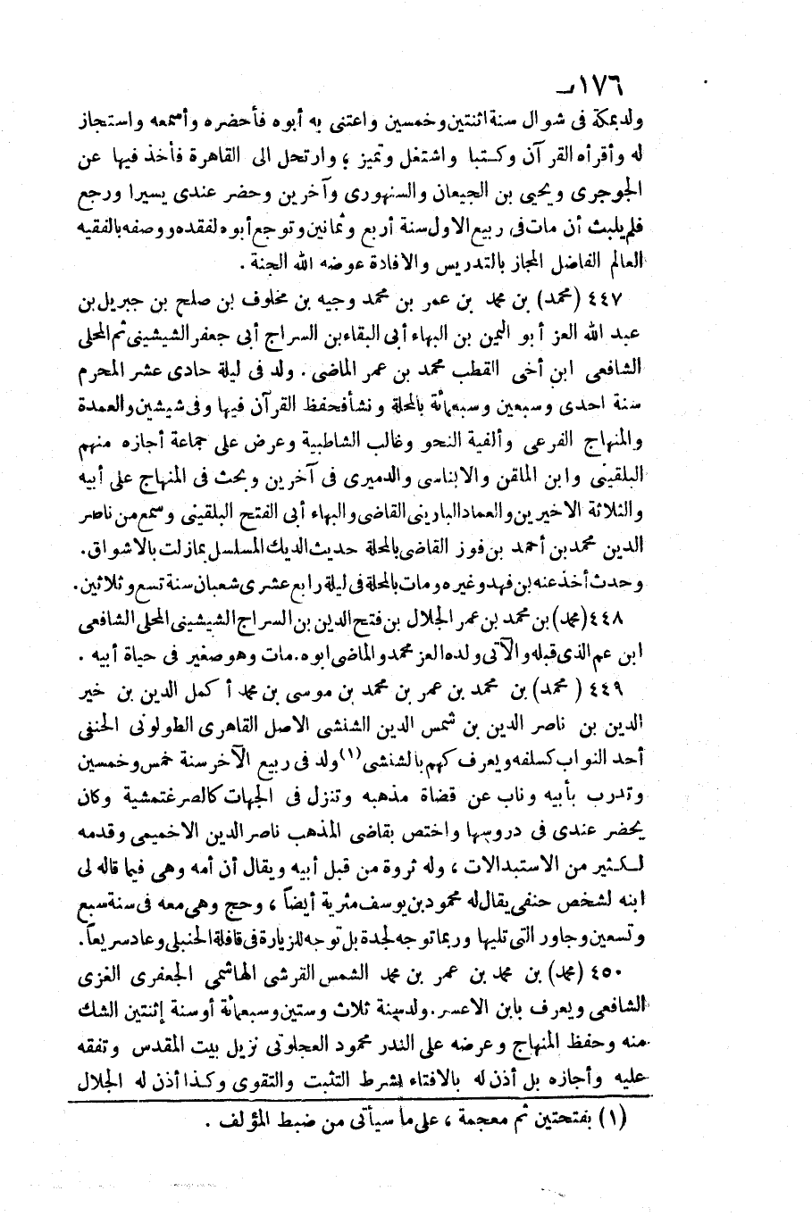 450 - مُحَمَّد بن مُحَمَّد بن عمر بن مُحَمَّد الشَّمْس الْقرشِي الْهَاشِمِي الْجَعْفَرِي الْغَزِّي الشَّافِعِي وَيعرف بِابْن الأعسر. / ولد سنة ثَلَاث وَسِتِّينَ وَسَبْعمائة أَو سنة اثْنَتَيْنِ الشَّك مِنْهُ وَحفظ الْمِنْهَاج وَعرضه على الندر مَحْمُود العجلوني نزيل بَيت الْمُقَدّس وتفقه عَلَيْهِ وَأَجَازَهُ بل أذن لَهُ بالإفتاء بِشَرْط التثبت وَالتَّقوى وَكَذَا أذن لَهُ الْجلَال