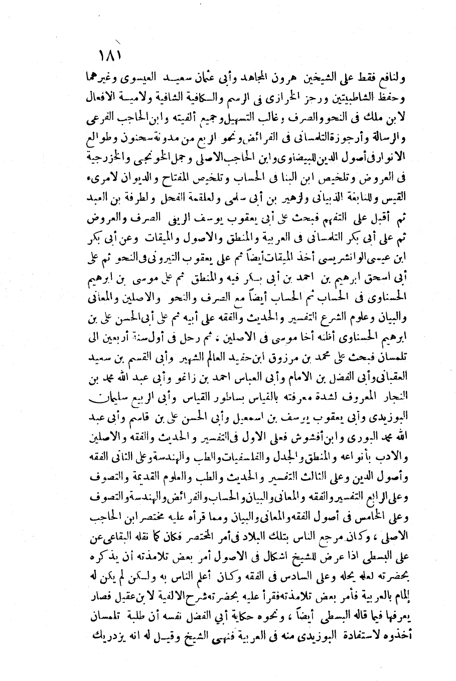 ولنافع فَقَط على الشَّيْخَيْنِ هرون الْمُجَاهِد وَأبي عُثْمَان سعيد العيسوي وَغَيرهمَا وَحفظ الشاطبيتين ورحز الخرازي فِي الرَّسْم والكافية الشافية ولامية الْأَفْعَال لِابْنِ ملك فِي النَّحْو وَالصرْف وغالب التسهيل وَجَمِيع ألفيته وَابْن الْحَاجِب الفرعي والرسالة وأرجوزة التلمساني فِي الْفَرَائِض وَنَحْو الرّبع من مدونة سَحْنُون وطوالع الْأَنْوَار فِي أصُول الدّين للبيضاوي وَابْن الْحَاجِب الْأَصْلِيّ وجمل الخونجي والخزرجية فِي الْعرُوض وتلخيص ابْن الْبَنَّا فِي الْحساب وتلخيص الْمِفْتَاح والديوان لامرئ الْقَيْس وللنابغة الذبياني ولزهير بن أبي سلمى ولعلقمة الْفَحْل ولطرفة بن العَبْد ثمَّ أقبل على التفهم فبحث على أبي يَعْقُوب يُوسُف الريفي الصّرْف وَالْعرُوض ثمَّ على أبي بكر التلمساني فِي الْعَرَبيَّة والمنطق وَالْأُصُول والميقات وَعَن أبي بكر بن عِيسَى الوانشريسي أَخذ الْمِيقَات أَيْضا ثمَّ على يَعْقُوب التيروني فِي النَّحْو ثمَّ على أبي إِسْحَق إِبْرَاهِيم بن أَحْمد بن أبي بكر فِيهِ والمنطق ثمَّ على مُوسَى بن إِبْرَاهِيم الحسناوي فِي الْحساب ثمَّ الْحساب أَيْضا مَعَ الصّرْف والنحو والأصلين والمعاني وَالْبَيَان وعلوم الشَّرْع التَّفْسِير والْحَدِيث وَالْفِقْه على أَبِيه ثمَّ على أبي الْحسن عَليّ بن إِبْرَاهِيم الحسناوي أَظُنهُ أَخا مُوسَى فِي الْأَصْلَيْنِ. ثمَّ رَحل فِي أول سنة أَرْبَعِينَ إِلَى تلمسان فبحث على مُحَمَّد بن مَرْزُوق ابْن حفيد الْعَالم الشهير وَأبي الْقسم بن سعيد العقباني وَأبي الْفضل بن الإِمَام وَأبي الْعَبَّاس أَحْمد بن زاغو وَأبي عبد الله مُحَمَّد بن النجار الْمَعْرُوف لشدَّة مَعْرفَته بِالْقِيَاسِ ببساطور الْقيَاس وَأبي الرّبيع سُلَيْمَان البوزيدي وَأبي يَعْقُوب يُوسُف بن إِسْمَعِيل وَأبي الْحسن عَليّ بن قَاسم وَأبي عبد الله مُحَمَّد البوري وَابْن أفشوش فعلى الأول فِي التَّفْسِير والْحَدِيث وَالْفِقْه والأصلين وَالْأَدب بأنواعه والمنطق والجدل والفلسفيات والطب والهندسة وعَلى الثَّانِي الْفِقْه وأصول الدّين وعَلى الثَّالِث التَّفْسِير والْحَدِيث والطب والعلوم الْقَدِيمَة والتصوف وعَلى الرَّابِع)