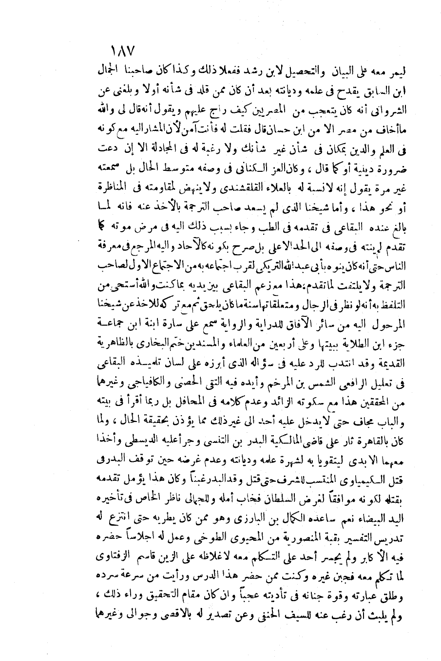 ليمر مَعَه على الْبَيَان والتحصيل لِابْنِ رشد ففعلا ذَلِك وَكَذَا كَانَ صاحبنا الْجمال ابْن السَّابِق يقْدَح فِي علمه وديانته بعد أَن كَانَ مِمَّن قلد فِي شَأْنه أَولا وَبَلغنِي عَن الشرواني أَنه كَانَ يتعجب من المصريين كَيفَ راج عَلَيْهِم وَيَقُول أَنه قَالَ لي وَالله مَا أَخَاف من مصر إِلَّا من ابْن حسان قَالَ فَقلت لَهُ فَأَنت آمن لِأَن الْمشَار إِلَيْهِ مَعَ كَونه فِي الْعلم وَالدّين بمَكَان فِي شَأْن غير شَأْنك وَلَا رَغْبَة لَهُ فِي المجادلة إِلَّا إِن دعت ضَرُورَة دينية أَو كَمَا قَالَ، وَكَانَ الْعِزّ الْكِنَانِي فِي وَصفه متوسط الْحَال بل سمعته غير مرّة يَقُول إِنَّه لَا نِسْبَة لَهُ بِالْعَلَاءِ القلقشندي وَلَا ينْهض لمقاومته فِي المناظرة أَو نَحْو هَذَا، وَأما شَيخنَا الَّذِي لم يسْعد صَاحب التَّرْجَمَة بِالْأَخْذِ عَنهُ فَإِنَّهُ لما بَالغ عِنْده البقاعي فِي تقدمه فِي الطِّبّ وَجَاء بِسَبَب ذَلِك إِلَيْهِ فِي مرض مَوته كَمَا تقدم لم ينْتَه فِي وَصفه إِلَى الْحَد الْأَعْلَى بل صرح بِكَوْنِهِ كالآحاد وَإِلَيْهِ الْمرجع فِي معرفَة النَّاس حَتَّى أَنه كَانَ يُنَوّه أبي عبد الله التريكي لقرب اجتماعه بِهِ من الِاجْتِمَاع الأول لصَاحب التَّرْجَمَة وَلَا يلْتَفت لما تقدم، هَذَا مَعَ زعم البقاعي بَين يَدَيْهِ بِمَا كنت وَالله أستحي من التَّلَفُّظ بِهِ أَنه لَو نظر فِي الرِّجَال ومتعلقاتها سنة مَا كَانَ يلْحق ثمَّ مَعَ تَركه للأخذ عَن شَيخنَا المرحول إِلَيْهِ من سَائِر الْآفَاق للدراية وَالرِّوَايَة سمع على سارة ابْنة ابْن جمَاعَة جُزْء ابْن الطلاية ببيتها وعَلى أَرْبَعِينَ من الْعلمَاء والمسندين ختم البُخَارِيّ بالظاهرية الْقَدِيمَة وَقد انتدب للرَّدّ عَلَيْهِ فِي سُؤَاله الَّذِي أبرزه على لِسَان تِلْمِيذه البقاعي فِي تَعْلِيل الرَّافِعِيّ الشَّمْس بن المرخم وأيده فِيهِ التقى الحصني)