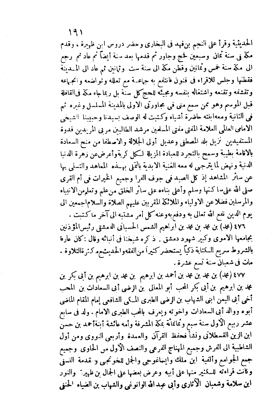 الحديثية وَقَرَأَ على النَّجْم بن فَهد فِي البُخَارِيّ وَحضر دروس ابْن ظهيرة، وَقدم مَكَّة فِي سنة ثَمَان وَسبعين فحج وجاور ثمَّ قدمهَا بعد سنة أَيْضا ثمَّ عَاد ثمَّ رَجَعَ إِلَى مَكَّة سنة خمس وَثَمَانِينَ وقطن مَكَّة إِلَى سنة سِتّ وَثَمَانِينَ ثمَّ عَاد إِلَى الْمَدِينَة فقطنها وَجلسَ للإقراء فِي فنون فَانْتَفع بِهِ جمَاعَة مَعَ تعلله وتواضعه وانجماعه وتقشفه وتقنعه واشتغاله بِنَفسِهِ ومجيئه لِلْحَجِّ كل سنة بل رُبمَا جَاءَ مَكَّة فِي الْقَافِلَة قبل الْمَوْسِم وَهُوَ مِمَّن سمع مني فِي مجاورتي الأولى بِالْمَدِينَةِ المسلسل وَغَيره ثمَّ فِي الثَّانِيَة وَمَعَهُ ابْنَته حَاضِرَة أَشْيَاء وكتبت لَهُ الْوَصْف بسيدنا وحبيبنا الشيخي الإمامي العالمي الْعَلامَة الْمُفْتِي مغتي الْمُسلمين مرشد الطالبين مربي المريدين قدوة المستفيدين نزيل بلد الْمُصْطَفى وعديل أولى الْجَلالَة والاصطفا من منح السَّعَادَة بِالْإِقَامَةِ بِطيبَة وسمح بالتجرد لِلْعِبَادَةِ المزيلة لكل كربَة وَأعْرض عَن زهرَة الدُّنْيَا الدنية ونهض لما يترجى لَهُ مَعَه الغنية الأبدية بالتملي بِهَذِهِ الْمعَاهد والتسلي بهَا عَن سَائِر الْمشَاهد إِذْ كل الصَّيْد فِي جَوف الفرا)