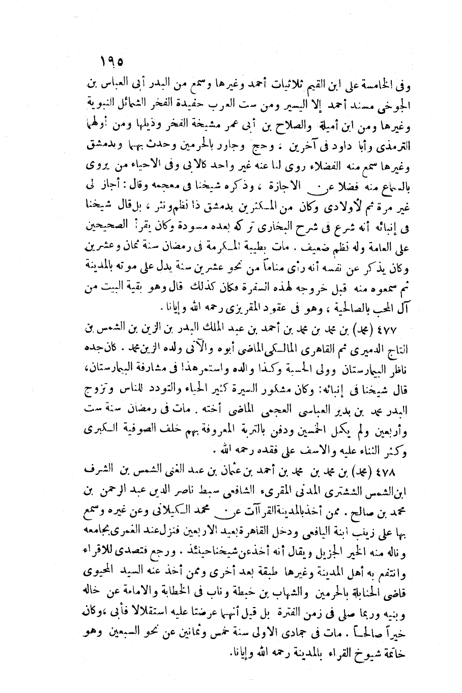 477 - مُحَمَّد بن مُحَمَّد بن مُحَمَّد بن أَحْمد بن عبد الْملك الْبَدْر بن الزين بن الشَّمْس بن التَّاج الدَّمِيرِيّ ثمَّ القاهري الْمَالِكِي / الْمَاضِي أَبوهُ والآتي وَلَده الزين مُحَمَّد. كَانَ جده نَاظر البيمارستان وَولي الْحِسْبَة وَكَذَا وَالِده وَاسْتمرّ هَذَا فِي مشارفة البيمارستان، قَالَ شَيخنَا فِي إنبائه: وَكَانَ مشكور السِّيرَة كثير الْحيَاء والتودد للنَّاس وَتزَوج الْبَدْر مُحَمَّد بن بدير العباسي العجمي الْمَاضِي أُخْته. مَاتَ فِي رَمَضَان سنة سِتّ وَأَرْبَعين وَلم يكمل الْخمسين وَدفن بالتربة الْمَعْرُوفَة بهم خلف الصُّوفِيَّة الْكُبْرَى وَكثر الثَّنَاء عَلَيْهِ والأسف على فَقده رَحمَه الله.