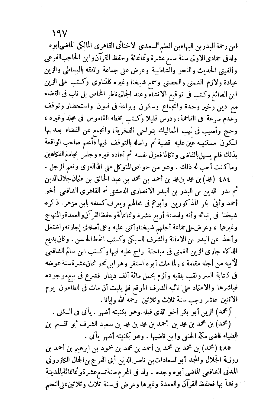 484 - مُحَمَّد بن مُحَمَّد بن مُحَمَّد بن أَحْمد بن مُحَمَّد بن عبد الْخَالِق بن عُثْمَان جلال الدّين ثمَّ بدر الدّين بن الْبَدْر بن الْبَدْر الْأنْصَارِيّ الدِّمَشْقِي ثمَّ القاهري الشَّافِعِي أَخُو أَحْمد وَأبي بكر الْمَذْكُورين وأبوهم فِي محالهم وَيعرف كسلفه بِابْن مزهر. / ذكره شَيخنَا فِي إنبائه وَأَنه ولد سنة أَربع عشرَة وَثَمَانمِائَة وَحفظ الْقُرْآن والعمدة والمنهاج وَغَيرهمَا، وَعرض على جمَاعَة أَجلهم شَيخنَا وَأثْنى عَلَيْهِ وعَلى أَصله فِي إِجَازَته واشتغل وَأخذ عَن الْبَدْر بن الْأَمَانَة والشرف السُّبْكِيّ وَكتب الْخط الْحسن. وَكَانَ بديع الذكاء جاري الزين القمني فِي مباحثه راج عَلَيْهِ فِيهَا وَكتب ابْن سَالم الشَّافِعِي لِأَبِيهِ من أَجله مقامة، وَلما مَاتَ أَبوهُ اسْتَقر وَهُوَ ابْن نَحْو ثَمَان عشرَة سنة عوضه فِي كِتَابَة السِّرّ ولقب بلقبه وألزم بِحمْل مائَة ألف دِينَار فشرع فِي بيع موجوده فباشرها والاعتماد على نَائِبه الشّرف الْموقع فَلم يلبث أَن مَاتَ فِي الطَّاعُون يَوْم الِاثْنَيْنِ عَاشر رَجَب سنة ثَلَاث وَثَلَاثِينَ رَحمَه الله وإيانا.