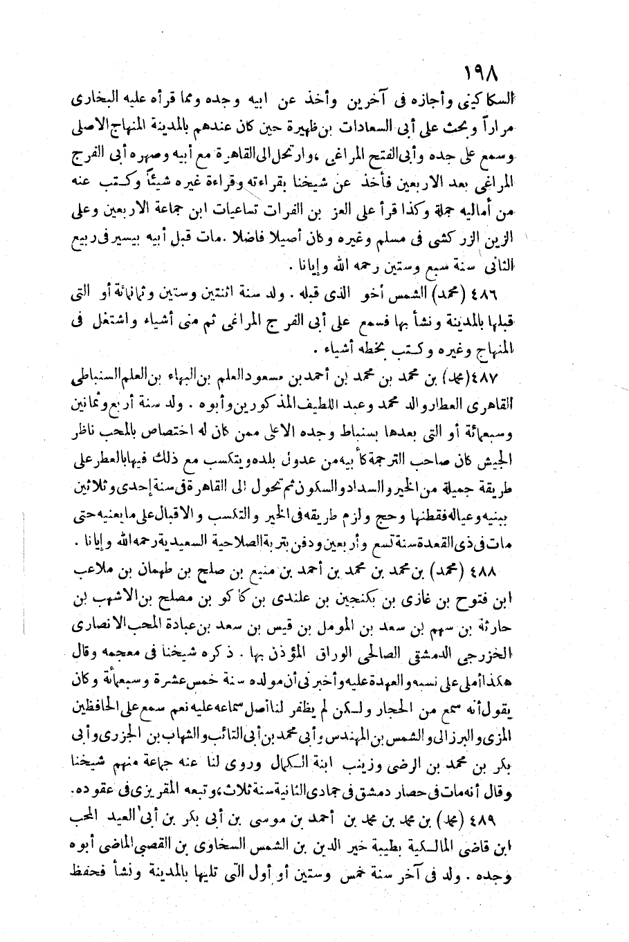 أَبِيه وصهره أبي الْفرج المراغي بعد الْأَرْبَعين فَأخذ عَن شَيخنَا بقرَاءَته وَقِرَاءَة غَيره شَيْئا وَكتب عَنهُ من أَمَالِيهِ جملَة وَكَذَا قَرَأَ على الْعِزّ بن الْفُرَات تساعيات ابْن جمَاعَة الْأَرْبَعين وعَلى الزين الزَّرْكَشِيّ فِي مُسلم وَغَيره وَكَانَ أصيلا فَاضلا. مَاتَ قبل أَبِيه بِيَسِير فِي ربيع الثَّانِي سنة سبع وَسِتِّينَ رَحمَه الله وإيانا. 486 مُحَمَّد الشَّمْس / أَخُو الَّذِي قبله. ولد سنة اثْنَتَيْنِ وَسِتِّينَ وَثَمَانمِائَة أَو الَّتِي قبلهَا بِالْمَدِينَةِ وَنَشَأ بهَا فَسمع على أبي الْفرج المراغي ثمَّ مني أَشْيَاء واشتغل فِي الْمِنْهَاج وَغَيره وَكتب بِخَطِّهِ أَشْيَاء.