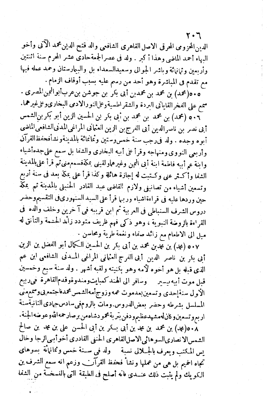 507 - مُحَمَّد بن مُحَمَّد بن مُحَمَّد بن أبي بكر بن الْحُسَيْن الْكَمَال أَبُو الْفضل بن الزين أبي بكر بن نَاصِر الدّين أبي الْفرج العثماني المراغي الْمدنِي الشَّافِعِي / ابْن عَم الَّذِي قبله بل هُوَ أَخُوهُ لأمه وَهُوَ بكنيته ولقبه أشهر. ولد سنة سبع وَخمسين قبل موت أَبِيه بِيَسِير. وسافر إِلَى الْهِنْد كمبايت ومندوة وَقدم الْقَاهِرَة فِي ربيع الأول سنة إِحْدَى وَتِسْعين بعد موت عَمه وَزوج أمه الشَّمْس مُحَمَّد فَاجْتمع بِي وَسمع مني المسلسل بِشَرْطِهِ وَحضر بعض الدُّرُوس. وَمَات بالروم فِي سادس جُمَادَى الثَّانِيَة سنة أَربع وَتِسْعين وَكَانَ لَهُ مشْهد عَظِيم وَدفن بتربة مَحْمُود شاه من برصا رَحمَه الله وعوضه الْجنَّة.