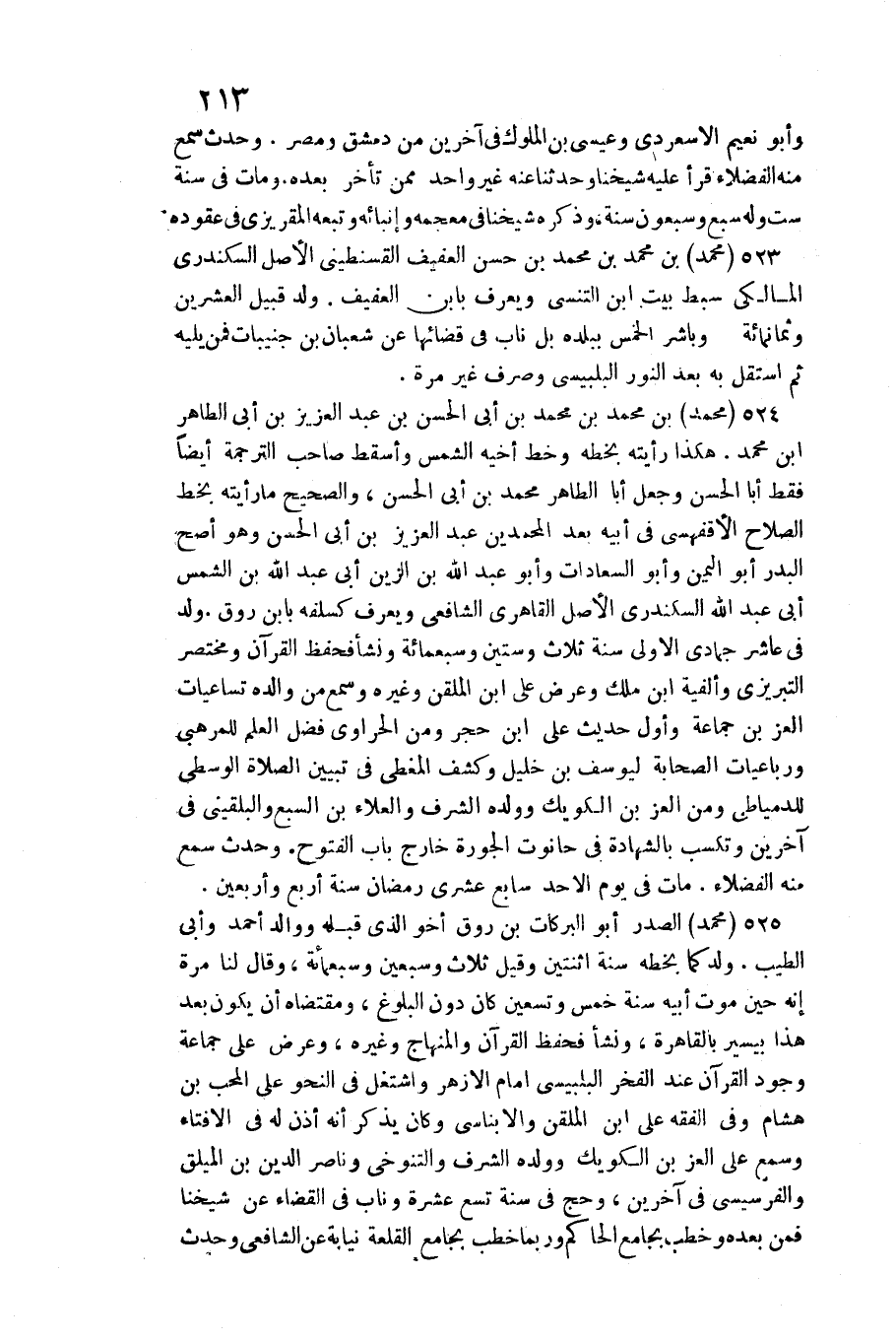 525 - مُحَمَّد الصَّدْر أَبُو البركات بن روق / أَخُو الَّذِي قبله ووالده أَحْمد وَأبي الطّيب. ولد كَمَا بِخَطِّهِ سنة اثْنَتَيْنِ وَقيل ثَلَاث وَسبعين وَسَبْعمائة، وَقَالَ لنا مرّة إِنَّه حِين موت أَبِيه سنة خمس وَتِسْعين كَانَ دون الْبلُوغ، وَمُقْتَضَاهُ أَن يكون بعد هَذَا بِيَسِير بِالْقَاهِرَةِ، وَنَشَأ فحفظ الْقُرْآن والمنهاج وَغَيره، وَعرض على جمَاعَة وجود الْقُرْآن عِنْد الْفَخر البلبيسي أَمَام الْأَزْهَر واشتغل فِي النَّحْو على الْمُحب بن هِشَام وَفِي الْفِقْه على ابْن الملقن والأبناسي وَكَانَ يذكر أَنه أذن لَهُ فِي الْإِفْتَاء وَسمع على الْعِزّ بن الكويك وَولده الشّرف والتنوخي وناصر الدّين بن اليلق والفرسيسي فِي آخَرين، وَحج فِي سنة تسع عشرَة وناب فِي الْقَضَاء عَن شَيخنَا فَمن بعده وخطب بِجَامِع الْحَاكِم وَرُبمَا خطب بِجَامِع القلعة نِيَابَة عَن الشَّافِعِي وَحدث