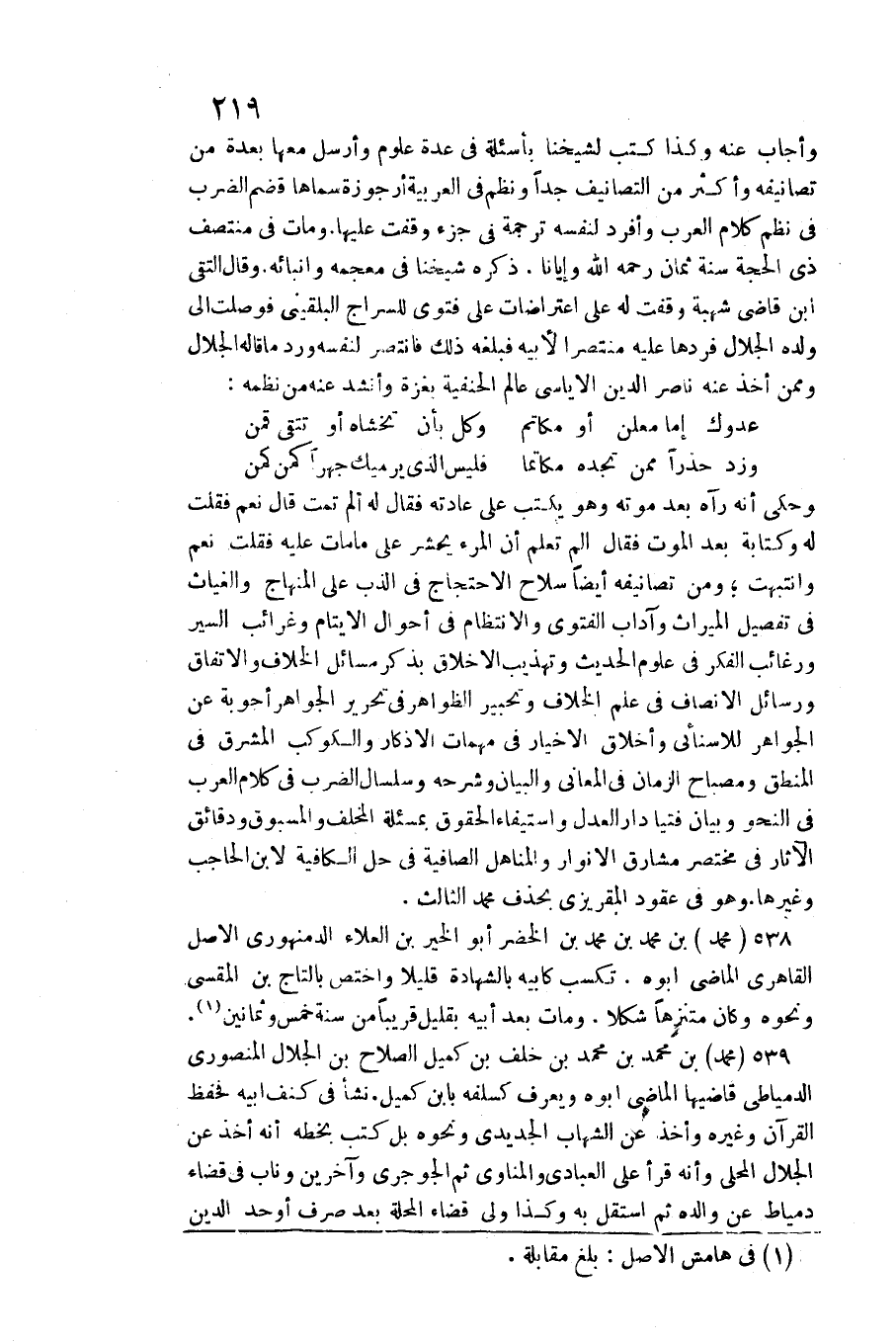 539 - مُحَمَّد بن مُحَمَّد بن مُحَمَّد بن خلف بن كميل الصّلاح بن الْجلَال المنصوري الدمياطي قاضيها الْمَاضِي أَبوهُ وَيعرف كسلفه بِابْن كميل. / نَشأ فِي كنف أَبِيه فحفظ الْقُرْآن وَغَيره وَأخذ عَن الشهَاب الجديدي وَنَحْوه بل كتب بِخَطِّهِ أَنه أَخذ عَن الْجلَال الْمحلي وَأَنه قَرَأَ على الْعَبَّادِيّ والمناوي ثمَّ الْجَوْجَرِيّ وَآخَرين وناب فِي قَضَاء دمياط عَن وَالِده ثمَّ اسْتَقل بِهِ وَكَذَا ولي قَضَاء)