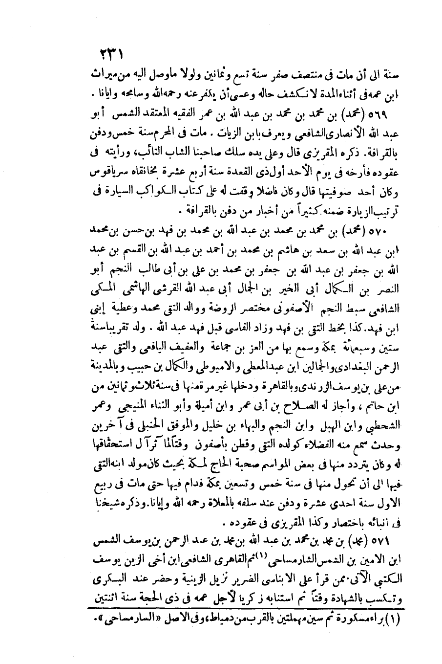 570 - مُحَمَّد بن مُحَمَّد بن مُحَمَّد بن عبد الله بن مُحَمَّد بن فَهد بن حسن بن مُحَمَّد بن عبد الله بن سعد بن هَاشم بن مُحَمَّد بن أَحْمد بن عبد الله بن الْقسم بن عبد الله بن جَعْفَر بن عبد الله بن جَعْفَر بن مُحَمَّد بن عَليّ بن أبي طَالب النَّجْم أَبُو النَّصْر بن الْكَمَال أبي الْخَيْر بن الْجمال أبي عبد الله الْقرشِي الْهَاشِمِي الْمَكِّيّ الشَّافِعِي سبط النَّجْم الأصفوني مُخْتَصر الرَّوْضَة ووالد التقي مُحَمَّد وعطية ابْني ابْن فَهد. / كَذَا بِخَط التقي بن فَهد وَزَاد الفاسي قبل فَهد عبد الله. ولد تَقْرِيبًا سنة سِتِّينَ وَسَبْعمائة بِمَكَّة وَسمع بهَا من الْعِزّ بن جمَاعَة والعفيف اليافعي والتقى عبد الرَّحْمَن الْبَغْدَادِيّ والجمالين ابْن عبد الْمُعْطِي والأميوطي والكمال بن حبيب وبالمدينة من عَليّ بن يُوسُف الزرندي وبالقاهرة ودخلها غير مرّة مِنْهَا فِي سنة ثَلَاث وَثَمَانِينَ من ابْن حَاتِم، وَأَجَازَ لَهُ الصّلاح بن أبي عمر وَابْن أميلة وَأَبُو الثَّنَاء المنيجي وَعمر الشحطبي وَابْن الهبل وَابْن النَّجْم والبهاء بن خَلِيل والموفق الْحَنْبَلِيّ فِي آخَرين وَحدث سمع مِنْهُ الْفُضَلَاء كولده التقى وقطن بأصفون وقتا لما آثر آل اسْتِحْقَاقهَا لَهُ وَكَانَ يتَرَدَّد مِنْهَا فِي بعض المواسم صُحْبَة الْحَاج لمَكَّة بِحَيْثُ كَانَ مولد ابْنه التقي فِيهَا إِلَى أَن تحول مِنْهَا فِي سنة خمس وَتِسْعين بِمَكَّة فدام فِيهَا حَتَّى مَاتَ فِي ربيع الأول سنة إِحْدَى عشرَة وَدفن عِنْد سلفه بالمعلاة رَحمَه الله وإيانا. وَذكره شَيخنَا فِي إنبائه بِاخْتِصَار وَكَذَا المقريزي فِي عقوده.