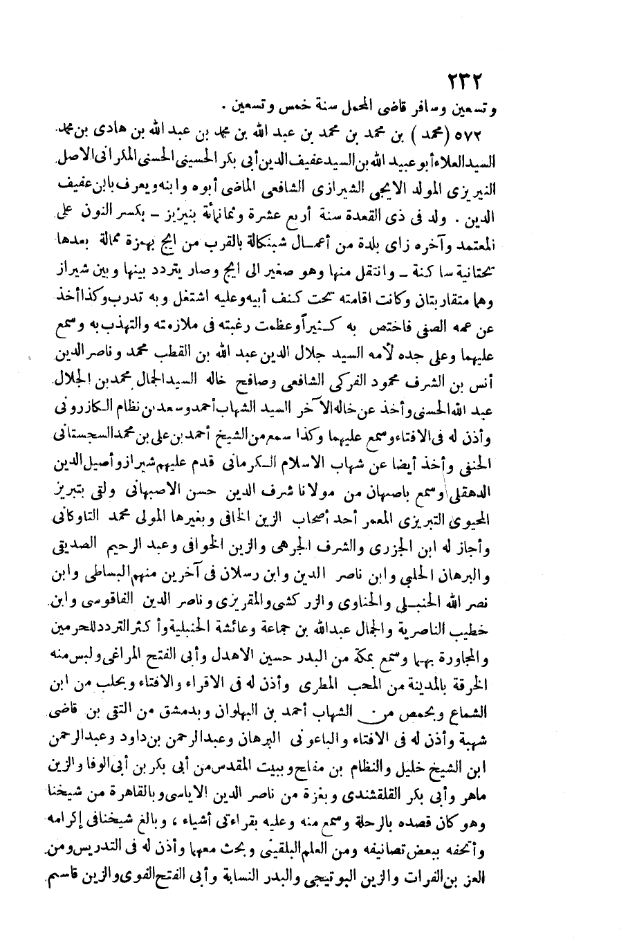 وَصَارَ يتَرَدَّد بَينهَا وَبَين شيراز وهما متقاربتان وَكَانَت إِقَامَته تَحت كنف أبيهوعليه اشْتغل وَبِه تدرب وَكَذَا أَخذ عَن عَمه الصفي فاختص بِهِ كثيرا وعظمت رغبته فِي ملازمته والتهذب بِهِ وَسمع عَلَيْهِمَا وعَلى جده لأمه السَّيِّد جلال الدّين عبد الله بن القطب مُحَمَّد وناصر الدّين أنس بن الشّرف مَحْمُود الفركي الشَّافِعِي وصافح خَاله السَّيِّد الْجمال مُحَمَّد بن الْجلَال عبد الله الحسني وَأخذ عَن خَاله الآخر السَّيِّد الشهَاب أَحْمد وَسعد بن نظام الكازروني وَأذن لَهُ فِي الْإِفْتَاء وَسمع عَلَيْهِمَا وَكَذَا سمع من الشَّيْخ أَحْمد بن عَليّ بن مُحَمَّد السجسْتانِي الْحَنَفِيّ وَأخذ أَيْضا عَن شهَاب الْإِسْلَام الْكرْمَانِي قدم عَلَيْهِم شيراز وأصيل الدّين الدهقلي وَسمع بأصبهان من مَوْلَانَا شرف الدّين حسن الْأَصْبَهَانِيّ وَلَقي بتبريز المحيوي التبريزي المعمر أحد أَصْحَاب الزين الخافي وبغيرها الْمولي مُحَمَّد التاوكاني وَأَجَازَ لَهُ ابْن الْجَزرِي والشرف الجرهي والزين الخوافي وَعبد الرَّحِيم الصديقي والبرهان الْحلَبِي وَابْن نَاصِر الدّين وَابْن رسْلَان فِي آخَرين مِنْهُم الْبِسَاطِيّ وَابْن نصر الله الْحَنْبَلِيّ والحناوي وَالزَّرْكَشِيّ والمقريزي وناصر الدّين الفاقوسي وَابْن خطيب الناصرية وَالْجمال عبد الله بن جمَاعَة وَعَائِشَة الحنبلية وَأكْثر التَّرَدُّد للحرمين والمجاورة بهما وَسمع بِمَكَّة من الْبَدْر حُسَيْن الأهدل وَأبي الْفَتْح المراغي وَلبس مِنْهُ الْخِرْقَة بِالْمَدِينَةِ من الْمُحب المطري وَأذن لَهُ فِي الإقراء والإفتاء وبحلب من ابْن الشماع وبحمص من الشهَاب أَحْمد بن البهلوان وبدمشق من التقي بن قَاضِي شُهْبَة وَأذن لَهُ فِي الْإِفْتَاء والباعوني والبرهان وَعبد الرَّحْمَن بن دَاوُد وَعبد الرَّحْمَن بن الشَّيْخ خَلِيل والنظام بن مُفْلِح وببيت الْمُقَدّس من أبي بكر بن أبي الوفا والزين ماهر وَأبي بكر القلقشندي وبغزة من نَاصِر الدّين الأياسي وبالقاهرة من شَيخنَا وَهُوَ كَانَ قَصده بالرحلة وَسمع مِنْهُ وَعَلِيهِ بِقِرَاءَتِي أَشْيَاء، وَبَالغ شَيخنَا فِي إكرامه وأتحفه بِبَعْض تصانيفه وَمن الْعلم البُلْقِينِيّ وَبحث مَعَهُمَا وَأذن لَهُ فِي التدريس وَمن الْعِزّ بن الْفُرَات والزين البوتيجي والبدر النسابة وَأبي الْفَتْح الفوي والزين قَاسم
