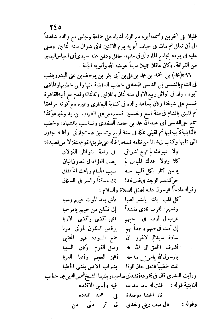 596 - مُحَمَّد بن مُحَمَّد بن مُحَمَّد بن عَليّ بن أبي بكر بن يُوسُف بن عَليّ الْبَدْر ويلقب فِي الشَّام بالشمس بن الشَّمْس الدِّمَشْقِي خطيب السابتية / مِنْهَا وَابْن خطيبها والماضي أَبوهُ. ولد فِي أَوَائِل ربيع الأول سنة ثَمَان وَثَلَاثِينَ وَثَمَانمِائَة وَقدم مَعَ أَبِيه الْقَاهِرَة فَسمع على شَيخنَا وَكَانَ يساعد وَالِده فِي كِتَابَة البُخَارِيّ وَغَيره مَعَ كَونه مراهقا ثمَّ لَقِيَنِي بِالشَّام فِي سنة تسع وَخمسين فَسمع معي على الشهَاب بن زيد وَغَيره وَكَذَا سمع على الشَّمْس أبي عبد الله مُحَمَّد بن حَامِد الصَّفَدِي وتكسب بِالشَّهَادَةِ وخطب بالنابتية كأبيه فِيهَا ثمَّ لَقِيَنِي بِمَكَّة فِي سنة أَربع وَتِسْعين فاستجازني وَأَظنهُ جاور الَّتِي تَلِيهَا وَكتب لي شَيْئا من نظمه فَمِنْهُ مِمَّا قَالَه على طَرِيق الْقَوْم متغزلا من قصيدة:)