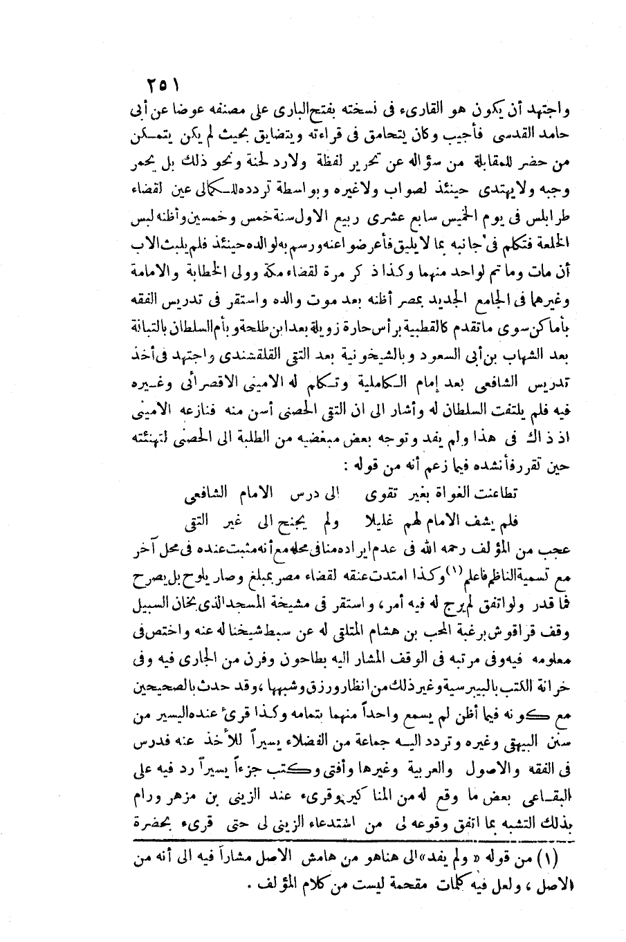 عجب من الْمُؤلف رَحمَه الله فِي عدم إِيرَاده منافي مَحَله مَعَ أَنه مُثبت عِنْده فِي مَحل آخر مَعَ تَسْمِيَة النَّاظِم فَاعْلَم وَكَذَا امتدت عُنُقه لقَضَاء مصر بمبلغ وَصَارَ يلوح بل يُصَرح فَمَا قدر وَلَو اتّفق لم يرج لَهُ فِيهِ أَمر، وَاسْتقر فِي مشيخة الْمَسْجِد الَّذِي بخان السَّبِيل وقف قراقوش برغبة الْمُحب بن هِشَام المتلقي لَهُ عَن سبط شَيخنَا لَهُ عَنهُ واختص فِي معلومه فِيهِ وَفِي مرتبه فِي الْوَقْف الْمشَار إِلَيْهِ بطاحون وفرن من الْجَارِي فِيهِ وَفِي خزانَة الْكتب بالبيبرسية وَغير ذَلِك من أنظار ورزق وَشبههَا، وَقد حدث بالصحيحين مَعَ كَونه فِيمَا أَظن لم يسمع وَاحِدًا مِنْهُمَا بِتَمَامِهِ وَكَذَا قرئَ عِنْده الْيَسِير من سنَن الْبَيْهَقِيّ وَغَيره وَتردد إِلَيْهِ جمَاعَة من الْفُضَلَاء يَسِيرا للأخذ عَنهُ فدرس فِي الْفِقْه وَالْأُصُول والعربية وَغَيرهَا وَأفْتى وَكتب جُزْءا يَسِيرا رد فِيهِ على البقاعي بعض مَا وَقع لَهُ من الْمَنَاكِير وَقُرِئَ عِنْد الزيني بن مزهر ورام بذلك التَّشَبُّه بِمَا اتّفق وُقُوعه لي من استدعاء الزيني لي حَتَّى قرئَ بِحَضْرَة