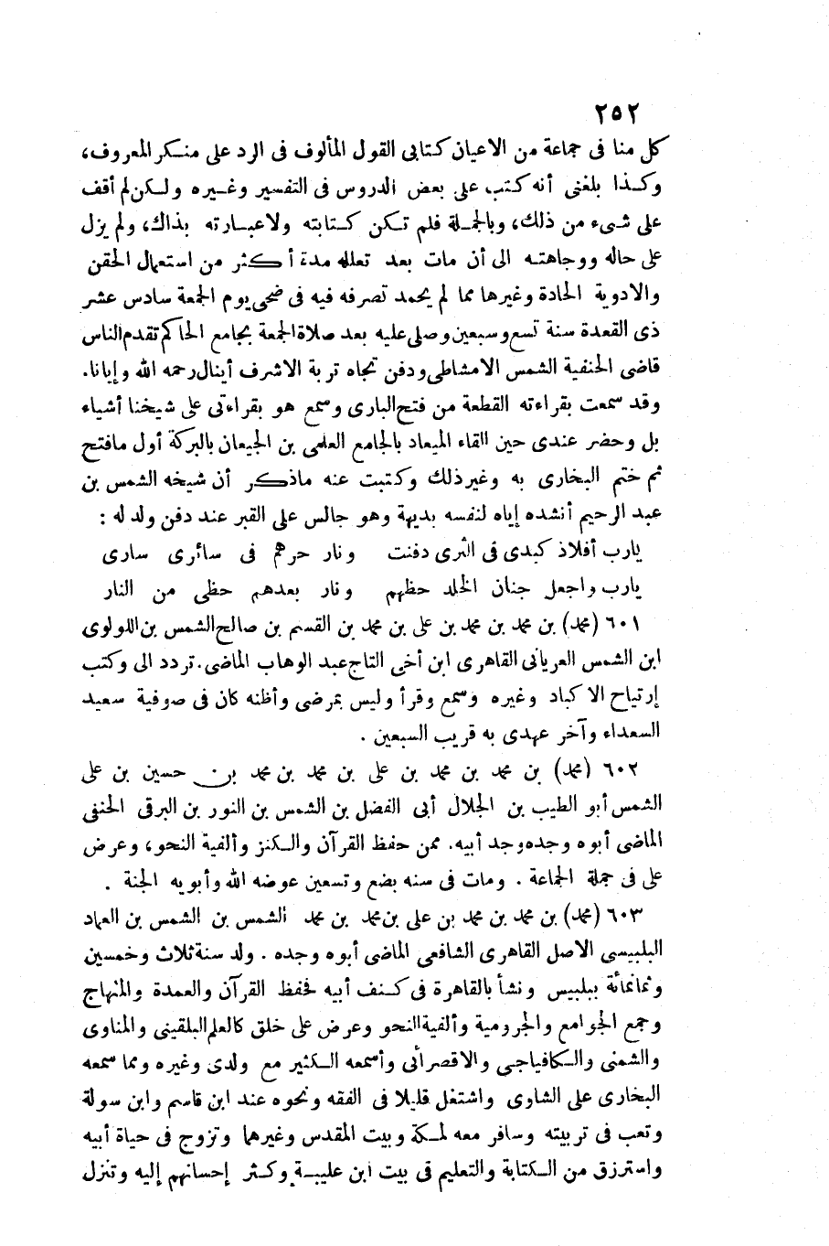 وَلم يزل على حَاله ووجاهته إِلَى أَن مَاتَ بعد تعلله مُدَّة أَكثر من اسْتِعْمَال الحقن والأدوية الحادة وَغَيرهَا مِمَّا لم يحمد تصرفه فِيهِ فِي ضحى يَوْم الْجُمُعَة سادس عشر ذِي الْقعدَة سنة تسع وَسبعين وَصلي عَلَيْهِ بعد صَلَاة الْجُمُعَة بِجَامِع الْحَاكِم تقدم النَّاس قَاضِي الْحَنَفِيَّة الشَّمْس الأمشاطي وَدفن تجاه تربة الْأَشْرَف أينال رَحمَه الله وإيانا. وَقد سَمِعت بقرَاءَته الْقطعَة من فتح الْبَارِي وَسمع هُوَ بِقِرَاءَتِي على شَيخنَا أَشْيَاء بل وَحضر عِنْدِي حِين إِلْقَاء الميعاد بالجامع العلمي بن الجيعان بِالْبركَةِ أول مَا فتح ثمَّ ختم البُخَارِيّ بِهِ وَغير ذَلِك وكتبت عَنهُ مَا ذكر أَن شَيْخه الشَّمْس بن عبد الرَّحِيم أنْشدهُ إِيَّاه لنَفسِهِ بديهة وَهُوَ جَالس على الْقَبْر عِنْد دفن ولد لَهُ: