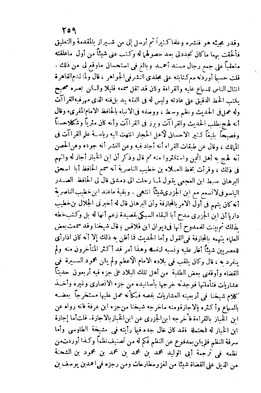وَقدر مَجِيئه هُوَ فنشره وعلما كثيرا ثمَّ أرسل إِلَيّ من شيراز بالمقدمة وَالتَّعْلِيق فألحقت بهما مَا كَانَ تجدّد لي بعد حصولهما لَهُ وَكتب عني شَيْئا من أول مَا علقته متعقبا على جمع رجال مُسْند أَحْمد وَبَالغ فِي اسْتِحْسَان مَا وَقع لي من ذَلِك. قلت حَسْبَمَا أوردته مَعَ كِتَابَته على مجلدي النشر فِي الْجَوَاهِر، قَالَ وَلما قدم الْقَاهِرَة انثال النَّاس للسماع عَلَيْهِ وَالْقِرَاءَة وَكَانَ قد ثقل سَمعه قَلِيلا وَلَكِن بَصَره صَحِيح يكْتب الْخط الدَّقِيق على عَادَته وَلَيْسَ لَهُ فِي الْفِقْه يَد بل فنه الَّذِي مهر فِيهِ القراآت وَله عمل فِي الحَدِيث ونظم وسط، وَوَصفه فِي الإنباء بِالْحَافِظِ الإِمَام الْمُقْرِئ وَقَالَ أَنه لهج بِطَلَب الحَدِيث والقراآت وبرز فِي القراآت وَأَنه كَانَ مثريا وشكلا حسنا وفصيحا بليغا كثير الْإِحْسَان لأهل الْحجاز انْتَهَت إِلَيْهِ رياسة علم القراآت فِي الممالك، وَقَالَ عَن طَبَقَات الْقُرَّاء أَنه أَجَاد فِيهِ وَعَن النشر أَنه جوده وَعَن الْحصن أَنه لهج بِهِ أهل الْيمن واستكثروا مِنْهُ ثمَّ قَالَ وَذكر أَن ابْن الخباز أجَاز لَهُ واتهم فِي ذَلِك، وقرأت بِخَط الْعَلَاء بن خطيب الناصرية أَنه سمع الْحَافِظ أَبَا إِسْحَق البرهابن سبط ابْن العجمي يَقُول لما رحلت إِلَى دمشق قَالَ لي الْحَافِظ الصَّدْر الياسوفي لَا تسمع مَعَ ابْن الْجَزرِي شَيْئا انْتهى. وَبَقِيَّة مَا عِنْد ابْن خطيب الناصرية أَنه كَانَ يتهم فِي أول الْأَمر بالمجازفة وَأَن الْبُرْهَان قَالَ لَهُ أَخْبرنِي الْجلَال بن خطيب داريا أَن ابْن الْجَزرِي مدح أَبَا الْبَقَاء السُّبْكِيّ بقصيدة زعم أَنَّهَا لَهُ بل وَكتب خطه بذلك ثمَّ بيّنت للممدوح أَنَّهَا فِي ديوَان ابْن قلاقس قَالَ شَيخنَا وَقد سَمِعت بعض الْعلمَاء يتهمه بالمجازفة فِي القَوْل وَأما الحَدِيث فَمَا أَظن بِهِ ذَلِك إِلَّا أَنه كَانَ إِذا رأى للعصريين شَيْئا أغار عَلَيْهِ وَنسبه لنَفسِهِ وَهَذَا أَمر قد أَكثر الْمُتَأَخّرُونَ مِنْهُ وَلم ينْفَرد بِهِ، قَالَ وَكَانَ يلقب فِي بِلَاده الإِمَام الْأَعْظَم وَلم يكن مَحْمُود السِّيرَة فِي الْقَضَاء وأوقفني بعض الطّلبَة من أهل تِلْكَ الْبِلَاد على جُزْء فِيهِ أَرْبَعُونَ حَدِيثا عشاريات فتأملتها فَوَجَدته خرجها بأسانيده من جُزْء الْأنْصَارِيّ وَغَيره وَأخذ كَلَام شَيخنَا فِي أربعينه العشاريات بفصه فَكَأَنَّهُ عمل عَلَيْهَا مستخرجا بعضه بِالسَّمَاعِ وَأَكْثَره بِالْإِجَازَةِ وَمِنْه مَا خرجه شَيخنَا من جُزْء ابْن عَرَفَة فَإِنَّهُ رَوَاهُ عَن ابْن الخباز بِالْقِرَاءَةِ فَأخْرجهُ ابْن الْجَزرِي عَن ابْن الخباز بِالْإِجَازَةِ. قلت أما إجَازَة)