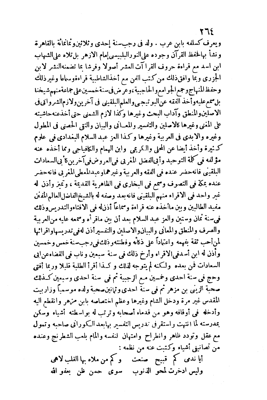 وإقرائها لمن أحب ثِقَة بفهمه واعتمادا على ذكائه وفطنته وَذَلِكَ فِي رَجَب سنة خمس وَخمسين وَأذن لَهُ بن أَسد فِي الإقراء وأرخ ذَلِك فِي سنة سبعين وناب فِي الْقَضَاء عَن أبي السعادات فَمن بعده وَلكنه لم يتَوَجَّه لذَلِك وَكَذَا أَقرَأ الطّلبَة قَلِيلا وَرُبمَا أفتى وَحج فِي سنة إِحْدَى وَخمسين مَعَ الرجبية ثمَّ فِي سنة إِحْدَى وَسبعين كَذَلِك صُحْبَة الزيني بن مزهر ثمَّ فِي سنة إِحْدَى وَثَمَانِينَ صُحْبَة وَلَده موسميا وزار بَيت الْمُقَدّس غير مرّة وَدخل الشَّام وَغَيرهَا وَعظم اخْتِصَاصه بِابْن مزهر وَانْقطع إِلَيْهِ وَأدْخلهُ فِي أوقافه وَهُوَ من قدماء أَصْحَابه وترتب لَهُ بواسطته أَشْيَاء وَسكن بمدرسته لما انْتَهَت وَاسْتقر فِي تدريس التَّفْسِير بهَا بعد الكوراني صَاحبه وتمول مَعَ عقل وتودد ظَاهر وانطراح وامتهان لنَفسِهِ وإلمام بلعب الشطرنج وَعِنْده من تصانيفي اشياء وكتبت عَنهُ من نظمه: