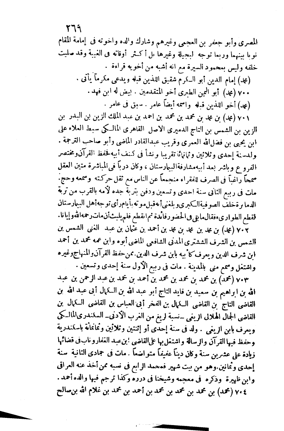 701 - مُحَمَّد بن مُحَمَّد بن مُحَمَّد بن مُحَمَّد بن أَحْمد بن عبد الْملك الزين بن الْبَدْر بن الزين بن الشَّمْس بن التَّاج الدَّمِيرِيّ الأَصْل القاهري الْمَالِكِي سبط الْعَلَاء عَليّ بن يحيى بن فضل الله الْعمريّ وَقَرِيب عبد الْقَادِر الْمَاضِي وَأَبُو صَاحب التَّرْجَمَة. / ولد سنة إِحْدَى وَثَلَاثِينَ وَثَمَانمِائَة تَقْرِيبًا وَنَشَأ فِي كنف أَبِيه فحفظ الْقُرْآن ومختصر الْفُرُوع وباشر بعد أَبِيه مشارفة البيمارستان، وَكَانَ دربا فِي الْمُبَاشرَة متين الْعقل سَمحا رَاغِبًا فِي الصّرْف للْفُقَرَاء منجمعا عَن النَّاس مَعَ ثقل حركته وسَمعه وَحج. مَاتَ فِي ربيع الثَّانِي سنة إِحْدَى وَتِسْعين وَدفن بتربة جده لأمه بِالْقربِ من تربة الدمارة خلف الصُّوفِيَّة الْكُبْرَى وَبَلغنِي أَنه قبل مَوته بأيام رأى توجه أهل البيمارستان لقطع الطوارئ فَقَالَ مَا بَقِي فِي الْحُضُور فَائِدَة ثمَّ انْقَطع فَلم يلبث أَن مَاتَ رَحمَه الله وإيانا.